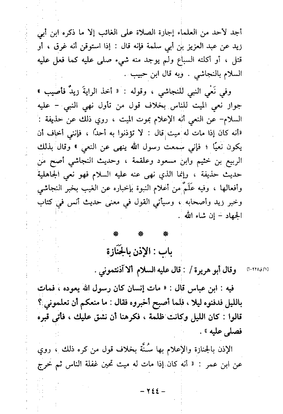أجد لأحد من العلماء إجازة الصلاة على الغائب إلا ما ذكره ابن أبى زيد، عن عبد العزيز بن أبى سلمة، فإنه قال: إذا استوقن أنه غرق، أو قتل، أو أكلته السباع، ولم يوجد منه شىء صلى عليه كما فعل (صلى الله عليه وسلم) بالنجاشى، وبه قال ابن حبيب. وفى نعى النبى للنجاشى، وقوله: (أخذ الراية زيدٌ فأصيب) جواز نعى الميت للناس بخلاف قول من تأول نهى النبى، (صلى الله عليه وسلم) ، عن النعى أنه الإعلام بموت الميت، روى ذلك حذيفة: (أنه كان إذا مات له ميت، قال: لا تؤذنوا به أحدًا، فإننى أخاف أن يكون نعيًا، فإنى سمعت رسول الله ينهى عن النعى) ، وقال بذلك الربيع بن خثيم، وابن مسعود وعلقمة، وحديث النجاشى أصح من حديث حذيفة، وإنما الذى نهى عنه (صلى الله عليه وسلم) فهو نعى الجاهلية وأفعالها، وفيه علمٌ من أعلام النبوة بإخباره عن الغيب بخبر النجاشى، وخبر زيد وأصحابه، وسيأتى القول فى معنى حديث أنس فى كتاب الجهاد، إن شاء الله.