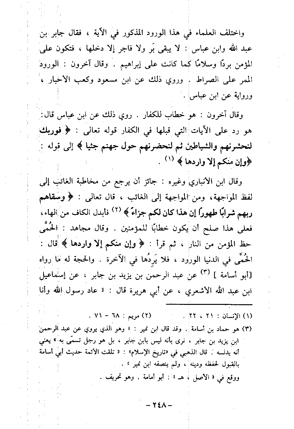 واختلف العلماء فى هذا الورود المذكور فى الآية، فقال جابر بن عبد الله وابن عباس: لا يبقى بَر ولا فاجر إلا دخلها، فتكون على المؤمن بردًا وسلامًا كما كانت على إبراهيم. وقال آخرون: الورود الممر على الصراط. وروى ذلك عن ابن مسعود، وكعب الأحبار، ورواية عن ابن عباس. وقال آخرون: هو خطاب للكفار، روى ذلك عن ابن عباس، قال: هو رد على الآيات التى قبلها فى الكفار قوله تعالى: (فوربك لنحشرنهم والشياطين ثم لنحضرنهم حول جهنم جثيا (إلى قوله: (وإن منكم إلا واردها) [مريم: 68، 71] . وقال ابن الأنبارى، وغيره: جائز أن يرجع من مخاطبته الغائب إلى لفظ المواجهة، ومن المواجهة إلى الغائب، قال تعالى: (وسقاهم ربهم شرابًا طهورًا إن هذا كان لكم جزاءً) [الإنسان: 21، 22] فأبدل الكاف من الهاء، فعلى هذا صلح أن يكون خطابًا للمؤمنين، وقال مجاهد: الحُمَّى حظ المؤمن من النار. ثم قرأ: (وإن منكم إلا واردها (قال: الحُمَّى فى الدنيا الورود، فلا يَرِدُها فى الآخرة. والحجة له ما رواه أبو أسامة، عن عبد الرحمن بن يزيد بن جابر، عن إسماعيل بن عبد الله الأشعرى، عن أبى هريرة، قال: عاد رسول الله (صلى الله عليه وسلم) وأنا