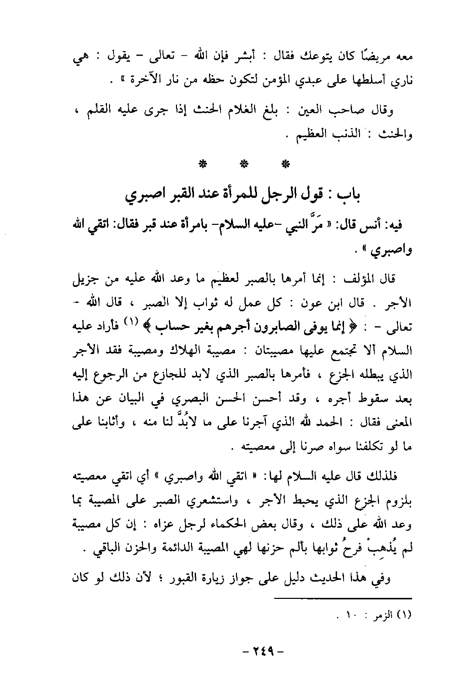/ 14 - فيه: أَنَس، قَالَ: مَرَّ النَّبِىُّ، (صلى الله عليه وسلم) ، بِامْرَأَةٍ عِنْدَ قَبْرٍ، فَقَالَ: (اتَّقِى اللَّهَ، وَاصْبِرِى) . قال المؤلف: إنما أمرها بالصبر لعظيم ما وعد الله عليه من جزيل الأجر. قال ابن عون: كل عمل له ثواب إلا الصبر، قال الله تعالى: (إنما يوفى الصابرون أجرهم بغير حساب) [الزمر: 10] ، فأراد (صلى الله عليه وسلم) ألا تجتمع عليها مصيبتان مصيبة الهلاك، ومصيبة فقد الأجر الذى يبطله الجزع، فأمرها بالصبر الذى لابد للجازع من الرجوع إليه بعد سقوط أجره، وقد أحسن الحسن البصرى فى البيان عن هذا المعنى، فقال: الحمد لله الذى آجرنا على ما لابُدَّ لنا منه، وأثابنا على ما لو تكلفنا سواه صرنا إلى معصيته. فلذلك قال (صلى الله عليه وسلم) لها: (اتقى الله واصبرى) ، أى اتقى معصيته بلزوم الجزع الذى يحبط الأجر، واستشعرى الصبر على المصيبة بما وعد الله على ذلك، وقال بعض الحكماء لرجل عزاه: إن كل مصيبة لم يُذهِبْ فرحُ ثوابها بألم حزنها لهى المصيبة الدائمة، والحزن الباقى. وفى هذا الحديث دليل على جواز زيارة القبور، لأن ذلك لو كان