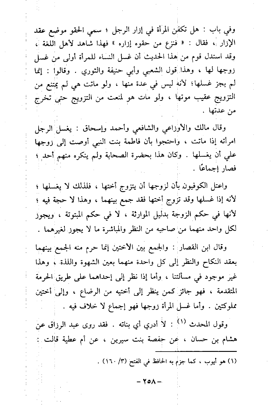 وفى باب: هل تكفن المرأة فى إزار الرجل، سمى الحقو موضع عقد الإزار، فقال: (فنزع من حقوه إزاره) ، فهذا شاهد لأهل اللغة، وقد استدل قوم من هذا الحديث أن غسل النساء للمرأة أولى من غسل زوجها لها، وهذا قول الشعبى، وأبى حنيفة، والثورى. وقالوا: إنما لم يجز غسلها، لأنه ليس فى عدة منها، ولو ماتت هى لم يمتنع من التزويج عقيب موتها، ولو مات هو لمنعت من التزويج حتى تخرج من عدتها. وقال مالك، والأوزاعى، والشافعى، وأحمد، وإسحاق: يغسل الرجل امرأته إذا ماتت، واحتجوا بأن فاطمة بنت النبى (صلى الله عليه وسلم) أوصت إلى زوجها على أن يغسلها. وكان هذا بحضرة الصحابة، ولم ينكره منهم أحد، فصار إجماعًا. واعتل الكوفيون بأن لزوجها أن يتزوج أختها، فلذلك لا يغسلها، لأنه إذا غسلها وقد تزوج أختها فقد جمع بينهما، وهذا لا حجة فيه، لأنها فى حكم الزوجة بدليل الموارثة، لا فى حكم المبتوتة، ويجوز لكل واحد منهما من صاحبه من النظر والمباشرة ما لا يجوز لغيرهما. وقال ابن القصار: والجمع بين الأختين إنما حرم منه الجمع بينهما بعقد النكاح والنظر إلى كل واحدة منهما بعين الشهوة واللذة، وهذا غير موجود فى مسألتنا، وأما إذا نظر إلى إحداهما على طريق الحرمة المتقدمة، فهو جائز كمن ينظر إلى أختيه من الرضاع، وإلى أختين مملوكتين. وأما غسل المرأة زوجها فهو إجماع لا خلاف فيه. وقول المحدث: لا أدرى أى بناته. فقد روى عبد الرزاق، عن هشام بن حسان، عن حفصة بنت سيرين، عن أم عطية، قالت:
