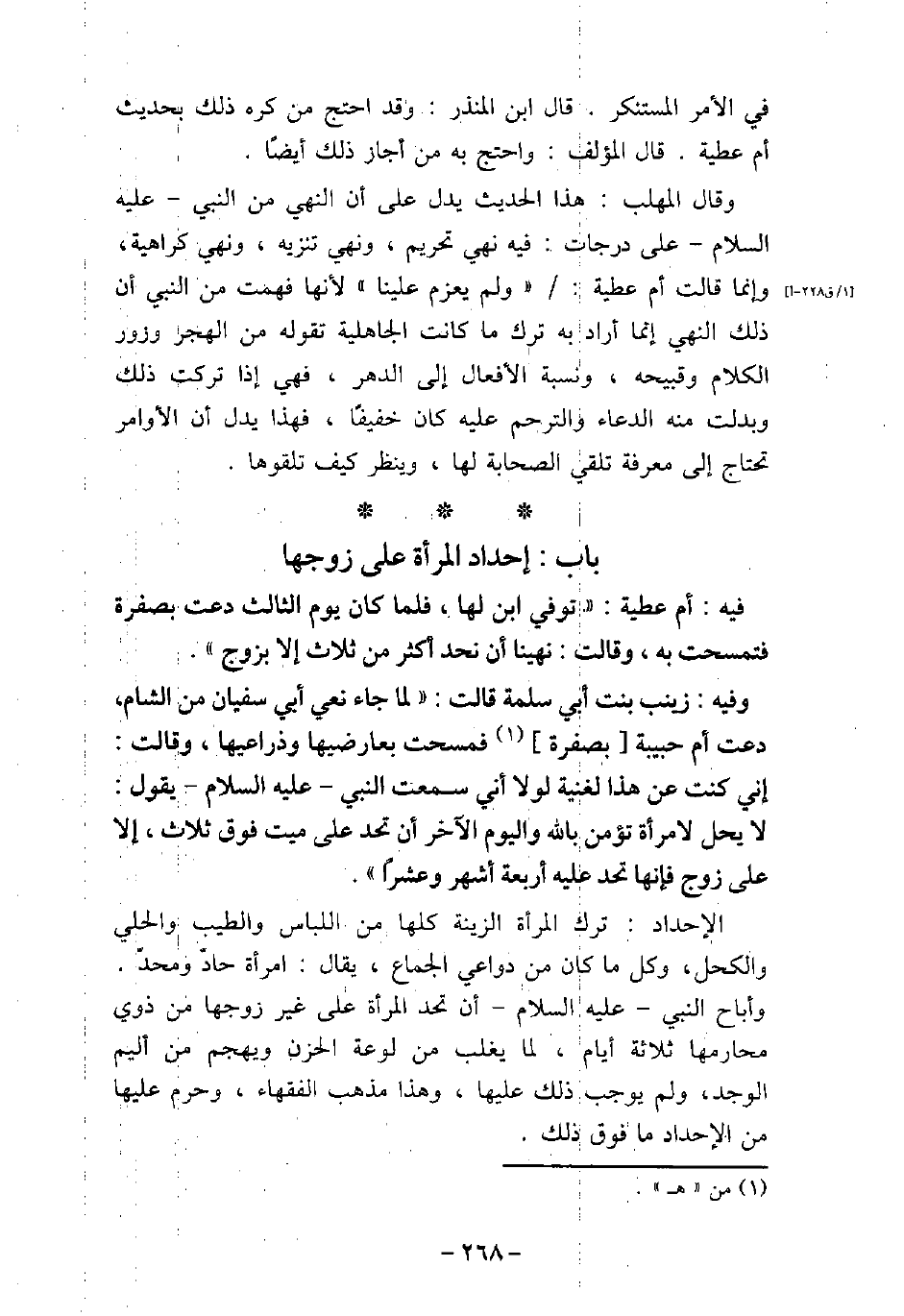 / 29 - فيه: أمّ عَطِيَّة، تُوُفِّيَ ابْن لها، فَلَمَّا كَانَ الْيَوْمُ الثَّالِثُ، دَعَتْ بِصُفْرَةٍ، فَتَمَسَّحَتْ بِهِ، وَقَالَتْ: نُهِينَا أَنْ نُحِدَّ أَكْثَرَ مِنْ ثَلاثٍ إِلا بِزَوْجٍ. / 30 - وفيه: زَيْنَبَ بِنْتِ أَبِى سَلَمَةَ، قَالَتْ: لَمَّا جَاءَ نَعْىُ أَبِى سُفْيَانَ مِنَ الشَّأْمِ، دَعَتْ أُمُّ حَبِيبَةَ بِصُفْرَةٍ، فَمَسَحَتْ بعَارِضَيْهَا وَذِرَاعَيْهَا، وَقَالَتْ: إِنِّى كُنْتُ عَنْ هَذَا لَغَنِيَّةً، لَوْلا أَنِّى سَمِعْتُ النَّبِىَّ، (صلى الله عليه وسلم) ، يَقُولُ: (لا يَحِلُّ لامْرَأَةٍ تُؤْمِنُ بِاللَّهِ وَالْيَوْمِ الآخِرِ أَنْ تُحِدَّ عَلَى مَيِّتٍ فَوْقَ ثَلاثٍ، إِلا عَلَى زَوْجٍ، فَإِنَّهَا تُحِدُّ عَلَيْهِ أَرْبَعَةَ أَشْهُرٍ وَعَشْرًا) . الإحداد: ترك المرأة الزينة كلها من اللباس والطيب والحلى والكحل، وكل ما كان من دواعى الجماع، يقال: امرأة حادّ ومحدّ. وأباح النبى، (صلى الله عليه وسلم) ، أن تحد المرأة على غير زوجها من ذوى محارمها ثلاثة أيام، لما يغلب من لوعة الحزن، ويهجم من أليم الوجد، ولم يوجب ذلك عليها، وهذا مذهب الفقهاء، وحرم عليها من الإحداد ما فوق ذلك.