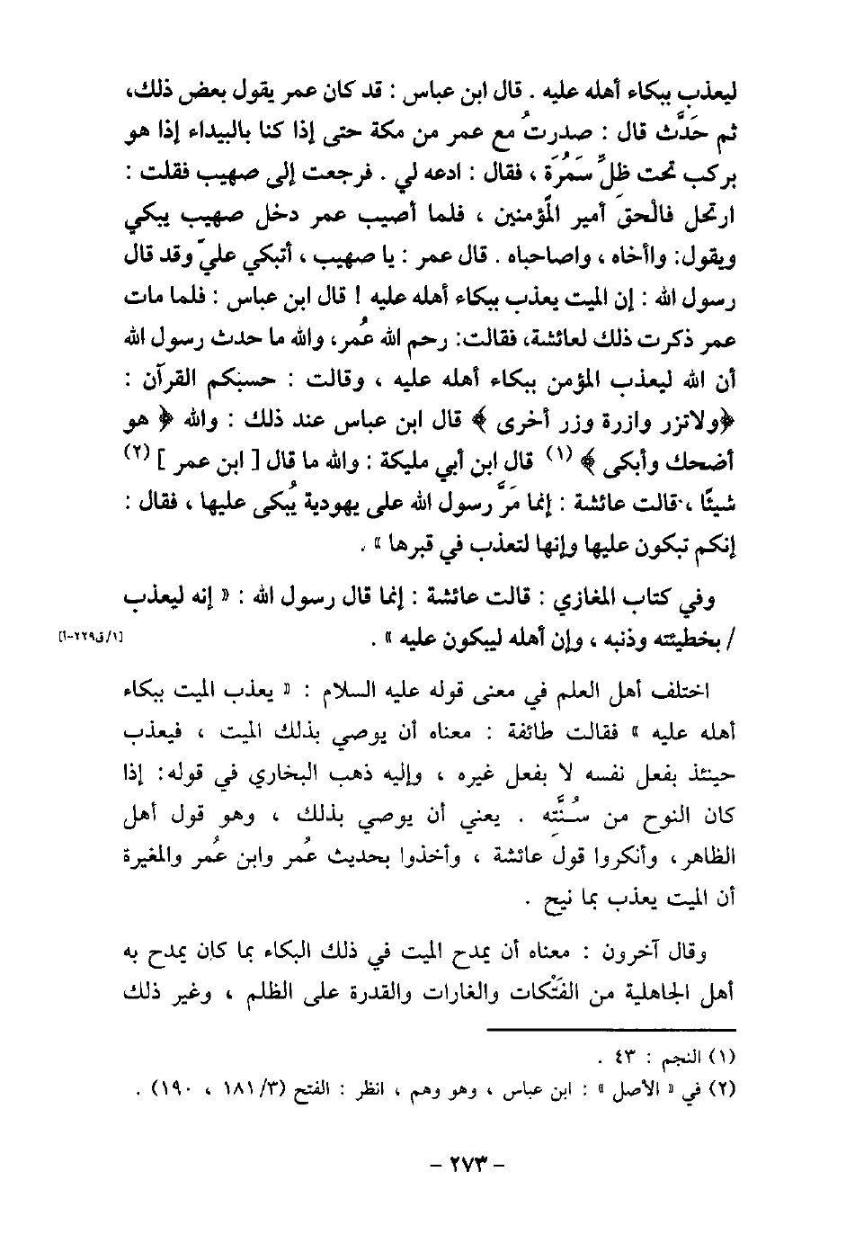 لَيُعَذَّبُ بِبُكَاءِ أَهْلِهِ عَلَيْهِ) . قَالَ ابْنُ عَبَّاسٍ: قَدْ كَانَ عُمَرُ يَقُولُ: بَعْضَ ذَلِكَ، ثُمَّ حَدَّثَ، قَالَ: صَدَرْتُ مَعَ عُمَرَ مِنْ مَكَّةَ حَتَّى إِذَا كُنَّا بِالْبَيْدَاءِ، إِذَا هُوَ بِرَكْبٍ تَحْتَ ظِلِّ سَمُرَةٍ، فَقَالَ: ادْعُهُ لِى، فَرَجَعْتُ إِلَى صُهَيْبٍ، فَقُلْتُ: ارْتَحِلْ، فَالْحَقْ أَمِيرَ الْمُؤْمِنِينَ، فَلَمَّا أُصِيبَ عُمَرُ، دَخَلَ صُهَيْبٌ يَبْكِى، يَقُولُ: وَا أَخَاهُ، وَا صَاحِبَاهُ، فَقَالَ عُمَرُ: يَا صُهَيْبُ أَتَبْكِى عَلَىَّ، وَقَدْ قَالَ رَسُولُ اللَّهِ (صلى الله عليه وسلم) : (إِنَّ الْمَيِّتَ يُعَذَّبُ بِبُكَاءِ أَهْلِهِ عَلَيْهِ) . قَالَ ابْنُ عَبَّاسٍ: فَلَمَّا مَاتَ عُمَرُ ذَكَرْتُ ذَلِكَ لِعَائِشَةَ، فَقَالَتْ: رَحِمَ اللَّهُ عُمَرَ، وَاللَّهِ مَا حَدَّثَ رَسُولُ اللَّهِ (صلى الله عليه وسلم) : إِنَّ اللَّهَ لَيُعَذِّبُ الْمُؤْمِنَ بِبُكَاءِ أَهْلِهِ عَلَيْهِ، وَقَالَتْ: حَسْبُكُمُ الْقُرْآنُ) وَلا تَزِرُ وَازِرَةٌ وِزْرَ أُخْرَى (قَالَ ابْنُ عَبَّاسٍ عِنْدَ ذَلِكَ: وَاللَّهُ) هُوَ أَضْحَكَ وَأَبْكَى) [النجم: 43] . قَالَ ابْنُ أَبِى مُلَيْكَةَ: وَاللَّهِ مَا قَالَ ابْنُ عُمَرَ شَيْئًا. قَالَتْ عائشة: إِنَّمَا مَرَّ رَسُولُ اللَّهِ (صلى الله عليه وسلم) عَلَى يَهُودِيَّةٍ، يَبْكِى عَلَيْهَا، فَقَالَ: (إِنَّهُمْ لَيَبْكُونَ عَلَيْهَا، وَإِنَّهَا لَتُعَذَّبُ فِى قَبْرِهَا) . / 35 - وفى كتاب المغازى: قالت عائشة: إنما قال رسول الله (صلى الله عليه وسلم) : (إنه ليعذب بخطيئته وذنبه، وإن أهله ليبكون عليه) . اختلف أهل العلم فى معنى قوله (صلى الله عليه وسلم) : (يعذب الميت ببكاء أهله عليه) ، فقالت طائفة: معناه أن يوصى بذلك الميت، فيعذب حينئذ بفعل نفسه لا بفعل غيره، وإليه ذهب البخارى فى قوله: إذا كان النوح من سنته، يعنى أن يوصى بذلك، وهو قول أهل الظاهر، وأنكروا قول عائشة، وأخذوا بحديث عمر، وابن عمر، والمغيرة أن الميت يعذب بما نيح. وقال آخرون: معناه أن يمدح الميت فى ذلك البكاء بما كان يمدح به أهل الجاهلية من الفتكات والغارات والقدرة على الظلم، وغير ذلك