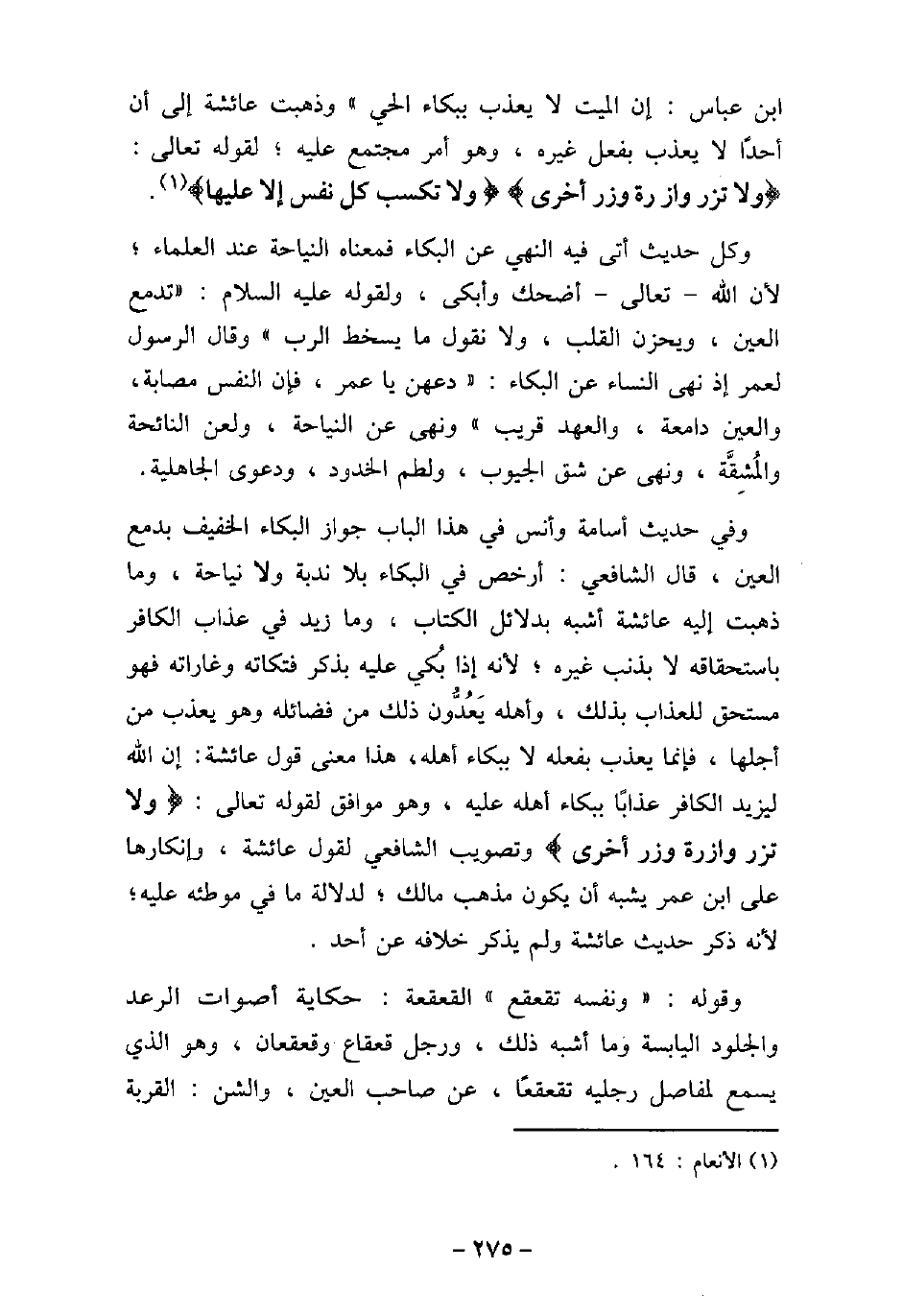 ابن عباس: إن الميت لا يعذب ببكاء الحى. وذهبت عائشة إلى أن أحدًا لا يعذب بفعل غيره، وهو أمر مجتمع عليه، لقوله تعالى: (ولا تزر وازرة وزر أخرى () ولا تكسب كل نفس إلا عليها) [الأنعام: 164] . وكل حديث أتى فيه النهى عن البكاء فمعناه النياحة عند العلماء، لأن الله تعالى أضحك وأبكى، ولقوله (صلى الله عليه وسلم) : (تدمع العين، ويحزن القلب، ولا نقول ما يسخط الرب) . وقال الرسول لعمر إذ نهى النساء عن البكاء: (دعهن يا عمر، فإن النفس مصابة، والعين دامعة، والعهد قريب) . ونهى عن النياحة، ولعن النائحة والمُشِقَّة، وهى عن شق الجيوب، ولطم الخدود، ودعوى الجاهلية. وفى حديث أسامة، وأنس فى هذا الباب جواز البكاء الخفيف بدمع العين، قال الشافعى: أرخص فى البكاء بلا ندبة، ولا نياحة، وما ذهبت إليه عائشة أشبه بدلائل الكتاب، وما زيد فى عذاب الكافر باستحقاقه لا بذنب غيره، لأنه إذا بُكى عليه بذكر فتكاته وغاراته فهو مستحق للعذاب بذلك، وأهله يَعُدُّون ذلك من فضائله وهو يعذب من أجلها، فإنما يعذب بفعله لا ببكاء أهله، هذا معنى قول عائشة: إن الله ليزيد الكافر عذابًا ببكاء أهله عليه، وهو موافق لقوله تعالى: (ولا تزر وازرة وزر أخرى (وتصويب الشافعى لقول عائشة، وإنكارها على ابن عمر يشبه أن يكون مذهب مالك، لدلالة ما فى موطئه عليه لأنه ذكر حديث عائشة، ولم يذكر خلافه عن أحد. وقوله: (ونفسه تقعقع) القعقعة: حكاية أصوات الرعد والجلود اليابسة وما أشبه ذلك، ورجل قعقاع وقعقعان، وهو الذى يسمع لمفاصل رجليه تقعقعًا، عن صاحب (العين) ، والشن: القربة