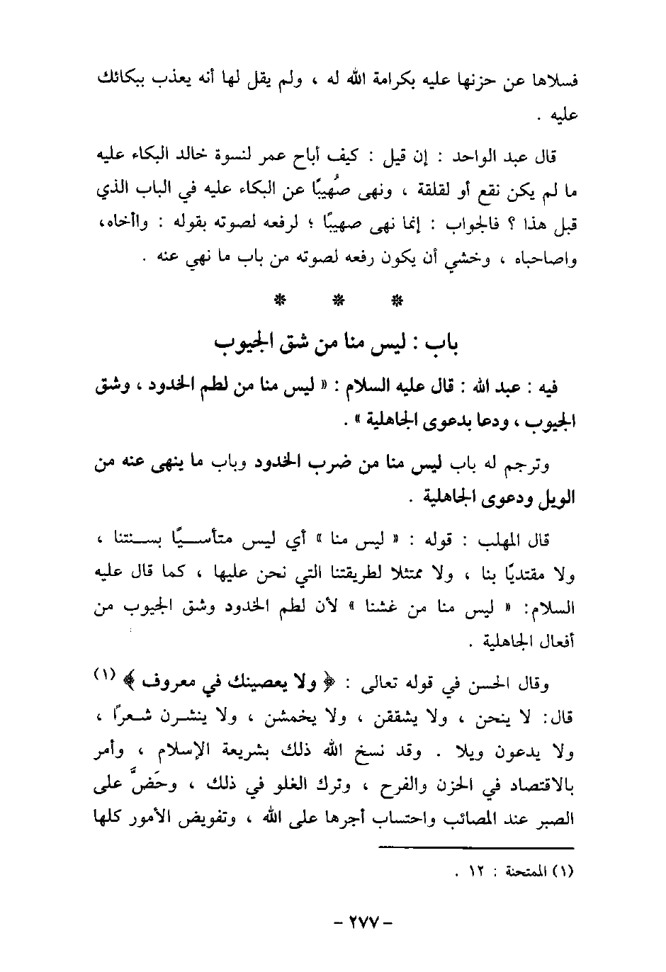 / 38 - فيه: عَنْ عَبْدِاللَّهِ، قَالَ (صلى الله عليه وسلم) : (لَيْسَ مِنَّا مَنْ لَطَمَ الْخُدُودَ، وَشَقَّ الْجُيُوبَ، وَدَعَا بِدَعْوَى الْجَاهِلِيَّةِ) . وترجم له باب (ليس منا من ضرب الخدود) ، وباب (ما ينهى عنه من الويل ودعوى الجاهلية) . قال المهلب: قوله: (ليس منا) أى ليس متأسيًا بسنتنا، ولا مقتديًا بنا، ولا ممتثلاً لطريقتنا التى نحن عليها، كما قال (صلى الله عليه وسلم) : (ليس منا من غشنا) لأن لطم الخدود وشق الجيوب من أفعال الجاهلية. وقال الحسن فى قوله تعالى: (ولا يعصينك فى معروف) [الممتحنة: 12] ، قال: لا ينحن، ولا يشققن، ولا يخمشن، ولا ينشرن شعرًا، ولا يدعون ويلاً. وقد نسخ الله ذلك بشريعة الإسلام، وأمر بالاقتصاد فى الحزن والفرح، وترك الغلو فى ذلك، وحَضَّ على الصبر عند المصائب واحتساب أجرها على الله، وتفويض الأمور كلها