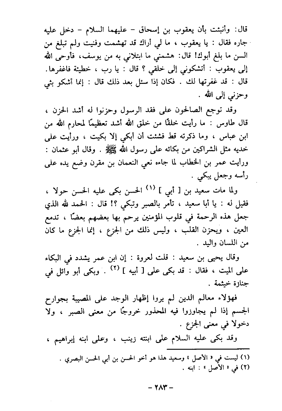 قال: وأنبئت بأن يعقوب بن إسحاق، عليهما السلام، دخل عليه جاره، فقال: يا يعقوب، ما لى أراك قد تهشمت وفنيت، ولم تبلغ من السن ما بلغ أبوك، قال: هشمنى ما ابتلانى به من يوسف، فأوحى الله إلى يعقوب: أتشكونى إلى خلقى؟ قال: يا رب، خطيئة فاغفرها، قال: قد غفرتها لك. فكان إذا سئل بعد ذلك، قال: (إنما أشكو بثى وحزنى إلى الله) [يوسف: 86] . وقد توجع الصالحون على فقد الرسول وحزنوا له أشد الحزن، قال طاوس: ما رأيت خلقًا من خلق الله أشد تعظيمًا لمحارم الله من ابن عباس، وما ذكرته قط فشئت أن أبكى إلا بكيت، ورأيت على خديه مثل الشراكين من بكائه على رسول الله (صلى الله عليه وسلم) . وقال أبو عثمان: ورأيت عمر بن الخطاب لما جاءه نعى النعمان بن مقرن وضع يده على رأسه وجعل يبكى. ولما مات سعيد بن أبى الحسن بكى عليه الحسن حولا، فقيل له: يا أبا سعيد، تأمر بالصبر وتبكى؟ قال: الحمد لله الذى جعل هذه الرحمة فى قلوب المؤمنين يرحم بها بعضهم بعضًا، تدمع العين، ويحزن القلب، وليس ذلك من الجزع، إنما الجزع ما كان من اللسان واليد. وقال يحيى بن سعيد: قلت لعروة: إن ابن عمر يشدد فى البكاء على الميت، فقال: قد بكى على أبيه. وبكى أبو وائل فى جنازة خيثمة. فهؤلاء معالم الدين لم يروا إظهار الوجد على المصيبة بجوارح الجسم إذا لم يجاوزوا فيه المحذور خروجًا من معنى الصبر، ولا دخولاً فى معنى الجزع. وقد بكى (صلى الله عليه وسلم) على ابنته زينب، وعلى ابنه إبراهيم،