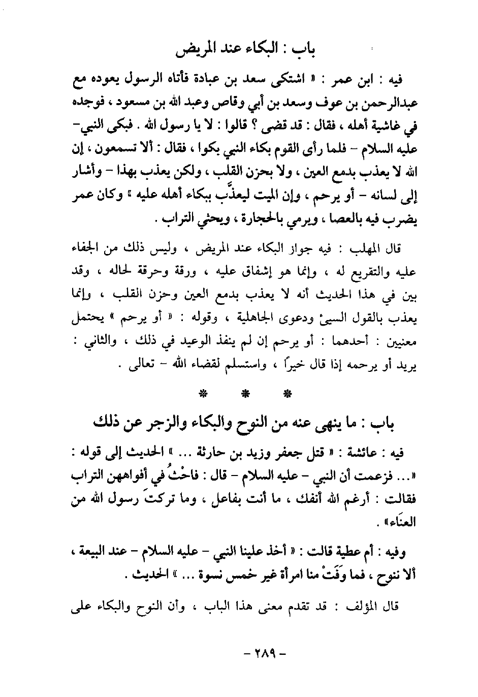 / 46 - فيه: ابْن عُمَر، اشْتَكَى سَعْدُ بْنُ عُبَادَةَ، فَأَتَاهُ الرسول يَعُودُهُ مَعَ عَبْدِالرَّحْمَنِ بْنِ عَوْفٍ، وَسَعْدِ بْنِ أَبِى وَقَّاصٍ، وَعَبْدِاللَّهِ بْنِ مَسْعُودٍ، فَوَجَدَهُ فِى غَاشِيَةِ أَهْلِهِ، فَقَالَ: (قَدْ قَضَى) ؟ قَالُوا: لا، يَا رَسُولَ اللَّهِ، فَبَكَى النَّبِىُّ (صلى الله عليه وسلم) ، فَلَمَّا رَأَى الْقَوْمُ بُكَاءَ النَّبِىِّ (صلى الله عليه وسلم) بَكَوْا، فَقَالَ: (أَلا تَسْمَعُونَ إِنَّ اللَّهَ لا يُعَذِّبُ بِدَمْعِ الْعَيْنِ، وَلا بِحُزْنِ الْقَلْبِ، وَلَكِنْ يُعَذِّبُ بِهَذَا - وَأَشَارَ إِلَى لِسَانِهِ - أَوْ يَرْحَمُ، وَإِنَّ الْمَيِّتَ يُعَذَّبُ بِبُكَاءِ أَهْلِهِ عَلَيْهِ) . وَكَانَ عُمَرُ يَضْرِبُ فِيهِ بِالْعَصَا، وَيَرْمِى بِالْحِجَارَةِ، وَيَحْثِى التُّرَابِ. قال المهلب: فيه جواز البكاء عند المريض، وليس ذلك من الجفاء عليه والتقريع له، وإنما هو إشفاق عليه، ورقة وحرقة لحاله، وقد بين فى هذا الحديث أنه لا يعذب بدمع العين، وحزن القلب، وإنما يعذب بالقول السيئ ودعوى الجاهلية، وقوله: (أو يرحم) يحتمل معنيين: أحدهما: أو يرحم إن لم ينفذ الوعيد فى ذلك، والثانى: يريد أو يرحمه إذا قال خيرًا، واستسلم لقضاء الله تعالى.