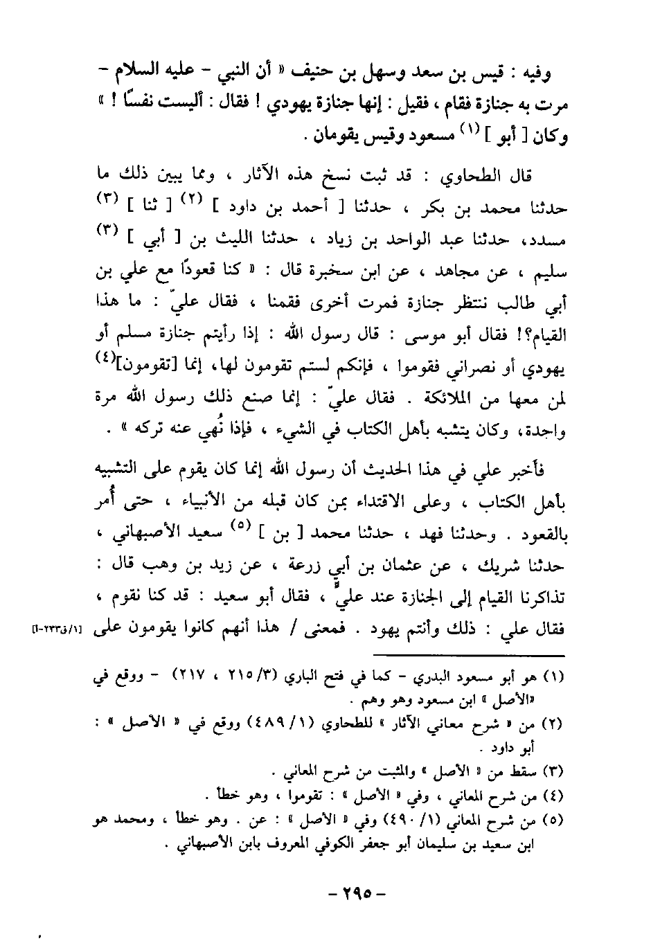 / 54 - وفيه: قَيْسُ بْنُ سَعْدٍ، وَسَهْلُ بْنُ حُنَيْفٍ، إِنَّ النَّبِىَّ، (صلى الله عليه وسلم) ، مَرَّتْ بِهِ جِنَازَةٌ، فَقَامَ، فَقِيلَ: إِنَّهَا جِنَازَةُ يَهُودِىٍّ، فَقَالَ: (أَلَيْسَتْ نَفْسًا) . وكَانَ أَبُو مَسْعُودٍ، وَقَيْسٌ يَقُومَان. قال الطحاوى: قد ثبت نسخ هذه الآثار، ومما يبين ذلك ما حدثنا محمد بن بكر، حدثنا أحمد بن داود، ثنا مسدد، حدثنا عبد الواحد بن زياد، حدثنا الليث بن أبى سليم، عن مجاهد، عن ابن سخبرة، قال: كنا قعودًا مع على بن أبى طالب ننتظر جنازة، فمرت أخرى فقمنا، فقال علىّ: ما هذا القيام؟ فقال أبو موسى: قال رسول الله: (إذا رأيتم جنازة مسلم، أو يهودى، أو نصرانى فقوموا، فإنكم لستم تقومون لها، إنما تقومون لمن معها من الملائكة) . فقال علىّ: إنما صنع ذلك رسول الله مرة واحدة، وكان يتشبه بأهل الكتاب فى الشىء، فإذا نُهى عنه تركه. فأخر على فى هذا الحديث أن رسول الله إنما كان يقوم على التشبيه بأهل الكتاب، وعلى الاقتداء بمن كان قبله من الأنبياء، حتى أُمر بالقعود. وحدثنا فهد، حدثنا محمد بن سعيد الأصبهانى، حدثنا شريك، عن عثمان بن أبى زرعة، عن زيد بن وهب، قال: تذاكرنا القيام إلى الجنازة عند علىٍّ، فقال أبو سعيد: قد كنا نقوم، فقال على: ذلك وأنتم يهود. فمعنى هذا أنهم كانوا يقومون على