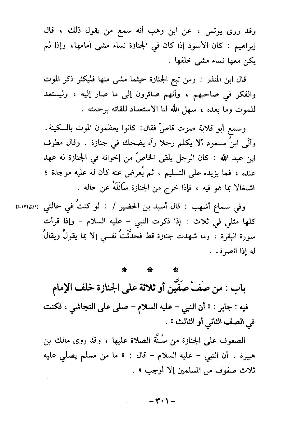 / 57 - فيه: جَابِر، أَنَّ النّبِىّ، (صلى الله عليه وسلم) ، صَلَّى عَلَى النَّجَاشِىِّ، فَكُنْتُ فِى الصَّفِّ الثَّانِى أَوِ الثَّالِثِ. الصفوف على الجنازة من سُنَّة الصلاة عليها، وقد روى مالك بن هبيرة، أن النبى، (صلى الله عليه وسلم) ، قال: (ما من مسلم يصلى عليه ثلاث صفوف من المسلمين إلا أوجب) .