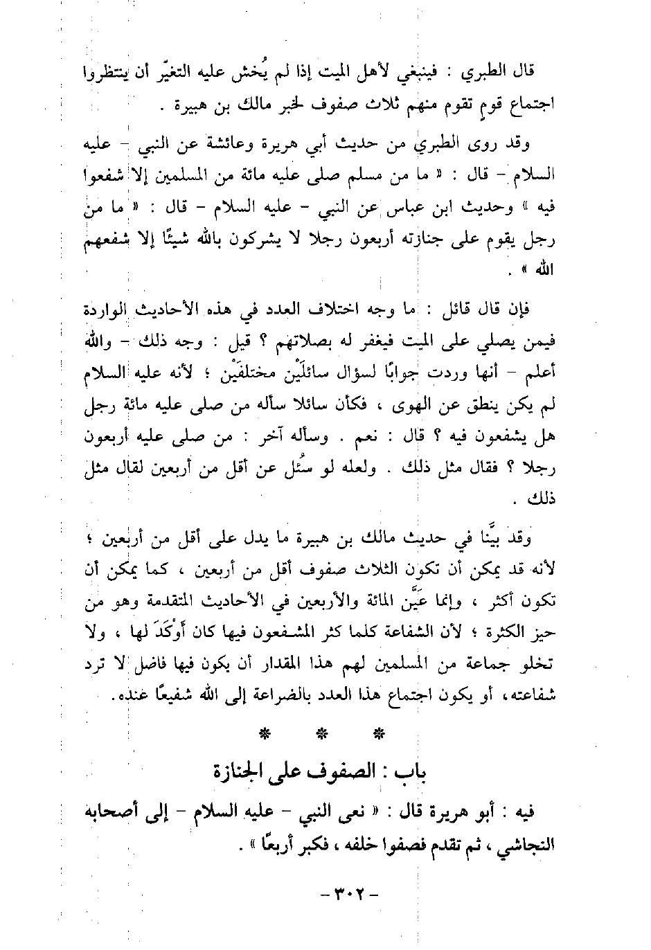 قال الطبرى: فينبغى لأهل الميت إذا لم يُخش عليه التغير أن ينتظروا اجتماع قومٍ تقوم منهم ثلاث صفوف لخبر مالك بن هبيرة. وقد روى الطبرى من حديث أبى هريرة، وعائشة، عن النبى، (صلى الله عليه وسلم) ، قال: (ما من مسلم صلى عليه مائة من المسلمين إلا شفعوا فيه) . وحديث ابن عباس، عن النبى، (صلى الله عليه وسلم) ، قال: (ما من رجل يقوم على جنازته أربعون رجلاً لا يشركون بالله شيئًا إلا شفعهم الله) . فإن قال قائل: ما وجه اختلاف العدد فى هذه الأحاديث الواردة فيمن يصلى على الميت فيغفر له بصلاتهم؟ . قيل: وجه ذلك، والله أعلم، أنها وردت جوابًا لسؤال سائلين مختلفين، لأنه (صلى الله عليه وسلم) لم يكن ينطق عن الهوى، فكأن سائلا سأله من صلى عليه مائة رجل هل يشفعون فيه؟ قال: نعم، وسأله آخر: من صلى عليه أربعون رجلاً؟ فقال مثل ذلك. ولعله لو سُئل عن أقل من أربعين لقال مثل ذلك. وقد بيَّنا فى حديث مالك بن هبيرة ما يدل على أقل من أربعين، لأنه قد يمكن أن تكون الثلاث صفوف أقل من أربعين، كما يمكن أن تكون أكثر، وإنما عَيَّن المائة والأربعين فى الأحاديث المتقدمة وهو من حيز الكثرة، لأن الشفاعة كلما كثر المشفعون فيها كان أَوْكَدَ لها، ولا تخلو جماعة من المسلمين لهم هذا المقدار أن يكون فيها فاضل لا ترد شفاعته، أو يكون اجتماع هذا العدد بالضراعة إلى الله شفيعًا عنده.