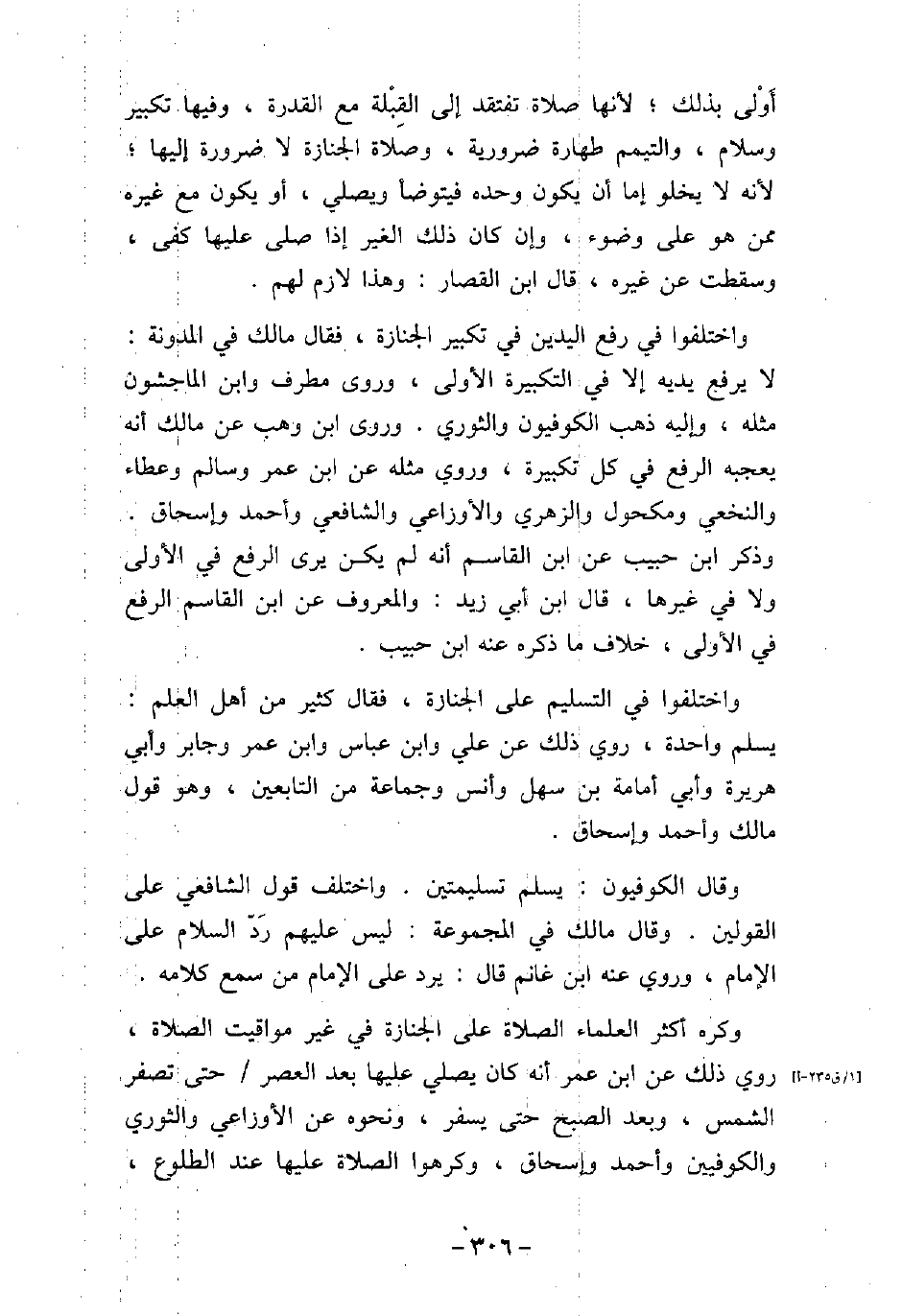 أولى بذلك، لأنها صلاة تفتقد إلى القبلة مع القدرة، وفيها تكبير وسلام، والتيمم طهارة ضرورية، وصلاة الجنازة لا ضرورة إليها، لأنه لا يخلو إما أن يكون وحده فيتوضأ ويصلى، أو يكون مع غيره ممن هو على وضوء، وإن كان ذلك الغير إذا صلى عليها كفى، وسقطت عن غيره، قال ابن القصار: وهذا لازم لها. واختلفوا فى رفع اليدين فى تكبير الجنازة، فقال مالك فى المدونة: لا يرفع يديه إلا فى التكبيرة الأولى، وروى مطرف وابن الماجشون مثله، وإليه ذهب الكوفيون والثورى. وروى ابن وهب عن مالك أنه يعجبه الرفع فى كل تكبيرة. وروى مثله عن ابن عمر، وسالم، وعطاء، والنخعى، ومكحول، والزهرى، والأوزاعى، والشافعى، وأحمد وإسحاق. وذكر ابن حبيب عن ابن القاسم أنه لم يكن يرى الرفع فى الأولى ولا فى غيرها، قال ابن أبى زيد: والمعروف عن ابن القاسم الرفع فى الأولى، خلاف ما ذكره عنه ابن حبيب. واختلفوا فى التسليم على الجنازة، فقال كثير من أهل العلم: يسلم واحدة، روى ذلك عن على، وابن عباس، وابن عمر، وجابر، وأبى هريرة، وأبى أمامة بن سهل، وأنس، وجماعة من التابعين، وهو قول مالك، وأحمد، وإسحاق. وقال الكوفيون: يسلم تسليمتين: واختلف قول الشافعى على القولين. وقال مالك فى (المجموعة) : ليس عليهم رَدّ السلام على الإمام، وروى عنه ابن غانم قال: يرد على الإمام من سمع كلامه. وكره أكثر العلماء الصلاة على الجنازة فى غير مواقيت الصلاة، روى ذلك عن ابن عمر أنه كان يصلى عليها بعد العصر حتى تصفر الشمس، وبعد الصبح حتى يسفر، ونحوه عن الأوزاعى، والثورى، والكوفيين، وأحمد، وإسحاق، وكرهوا الصلاة عليها عند الطلوع،