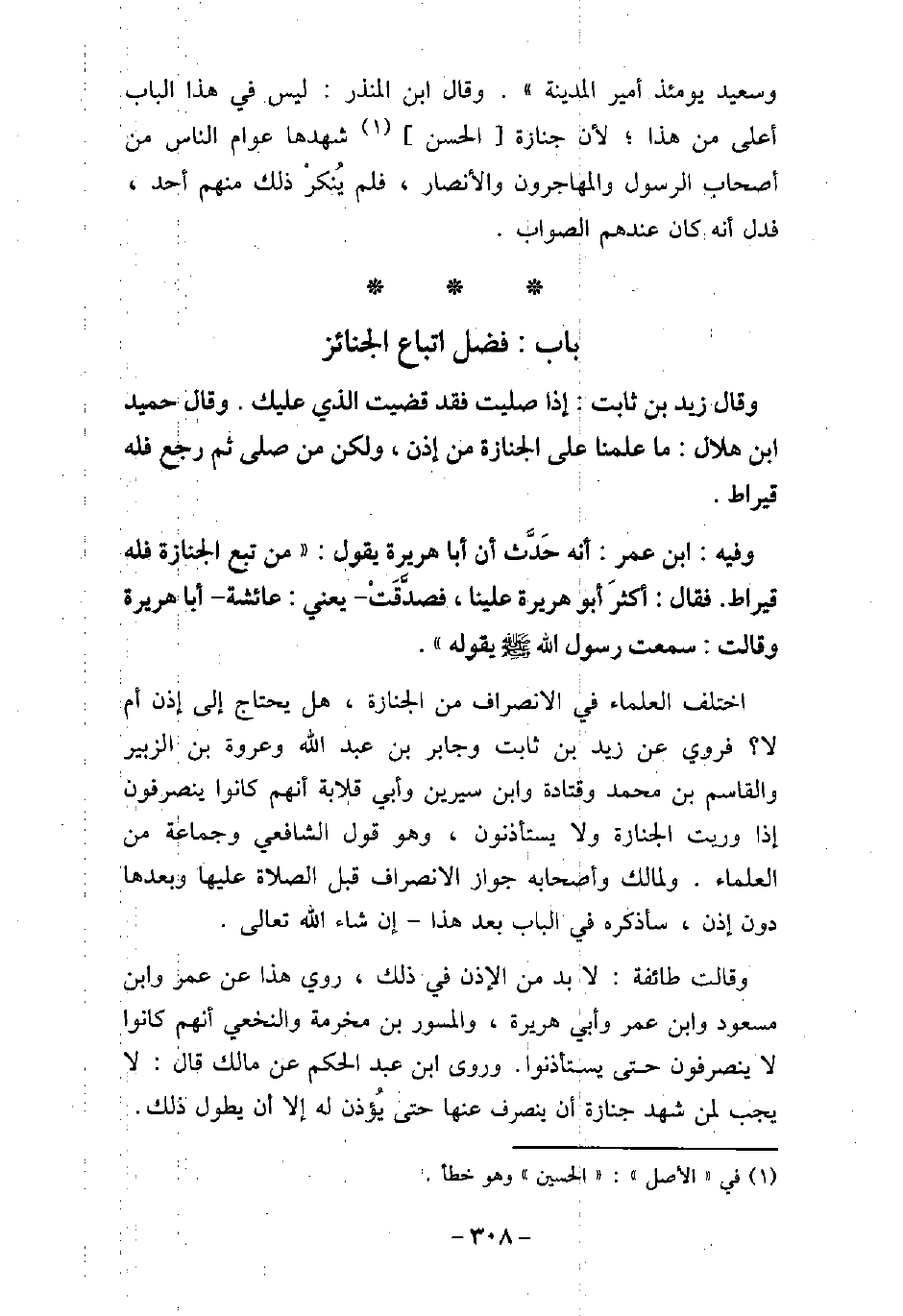 وَقَالَ زَيْدُ بْنُ ثَابِتٍ: إِذَا صَلَّيْتَ فَقَدْ قَضَيْتَ الَّذِى عَلَيْكَ. وَقَالَ حُمَيْدُ بْنُ هِلالٍ: مَا عَلِمْنَا عَلَى الْجَنَازَةِ إِذْنًا، وَلَكِنْ مَنْ صَلَّى ثُمَّ رَجَعَ فَلَهُ قِيرَاطٌ. / 63 - فيه: ابْنُ عُمَرَ أَنّه حدث أَنَّ أَبَا هُرَيْرَةَ يَقُولُ: مَنْ تَبِعَ جَنَازَةً فَلَهُ قِيرَاطٌ، فَقَالَ: أَكْثَرَ أَبُو هُرَيْرَةَ عَلَيْنَا، فَصَدَّقَتْ - يَعْنِى عَائِشَةَ - أَبَا هُرَيْرَةَ، وَقَالَتْ: سَمِعْتُ رَسُولَ اللَّهِ (صلى الله عليه وسلم) يَقُولُهُ. اختلف العلماء فى الانصراف من الجنازة، هل يحتاج إلى أذن أم لا؟ فروى عن زيد ابن ثابت، وجابر بن عبد الله، وعروة بن الزبير، والقاسم بن محمد، وقتادة، وابن سيرين، وأبى قلابة أنهم كانوا ينصرفون إذا رويت الجنازة، ولا يستأذنون، وهو قول الشافعى، وجماعة من العلماء. ولمالك وأصحابه جواز الانصراف قبل الصلاة عليها، وبعدها دون إذن، سأذكره فى الباب بعد هذا، إن شاء الله تعالى. وقالت طائفة: لابد من الإذن فى ذلك، روى هذا عن عمر، وابن مسعود، وابن عمر، وأبى هريرة، والمسور بن مخرمة، والنخعى أنهم كانوا لا ينصرفون حتى يستأذنوا. وروى ابن عبد الحكم عن مالك، قال: لا يجب لمن شهد جنازة أن ينصرف عنها حتى يُؤذن له إلا أن يطول ذلك.