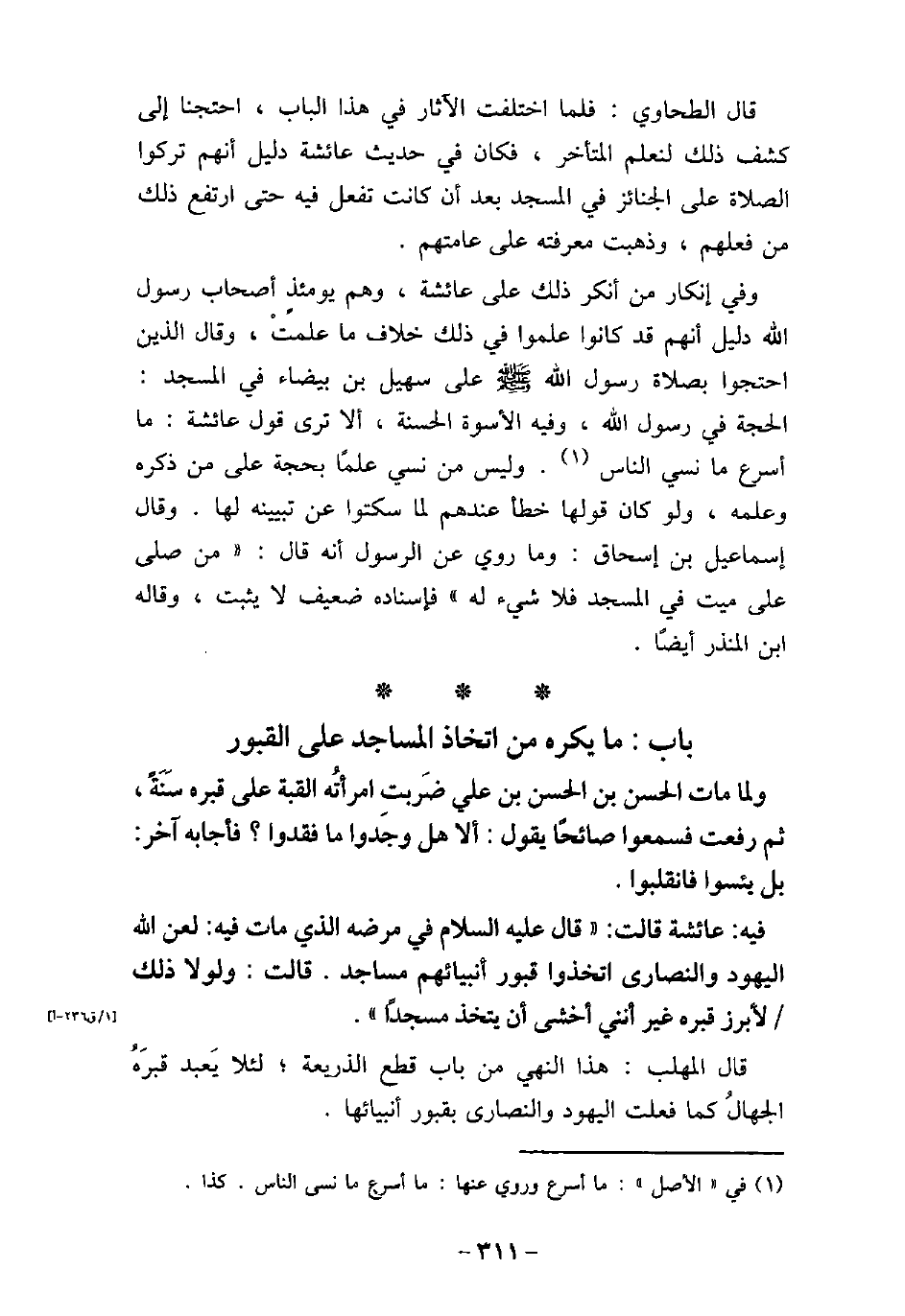 قال الطحاوى: فلما اختلفت الآثار فى هذا الباب، احتجنا إلى كشف ذلك لنعلم المتأخر، فكان فى حديث عائشة دليل أنهم تركوا الصلاة على الجنائز فى المسجد بعد أن كانت تفعل فيه حتى ارتفع ذلك من فعلهم، وذهبت معرفته على عامتهم. وفى إنكار من أنكر ذلك على عائشة، وهم يومئذٍ أصحاب رسول الله دليل أنهم قد كانوا علموا فى ذلك خلاف ما علمت، وقال الذين احتجوا بصلاة رسول الله (صلى الله عليه وسلم) على سهيل بن بيضاء فى المسجد: الحجة فى رسول الله، وفيه الأسوة الحسنة، ألا ترى قول عائشة: ما أسرع ما نسى الناس. وليس من نسى علمًا بحجة على من ذكره وعلمه، ولو كان قولها خطأ عندهم لما سكتوا عن تبيينه لها. وقال إسماعيل بن إسحاق: وما روى عن الرسول أنه قال: (من صلى على ميت فى المسجد فلا شىء له) ، فإسناده ضعيف لا يثبت، وقاله ابن المنذر أيضًا.