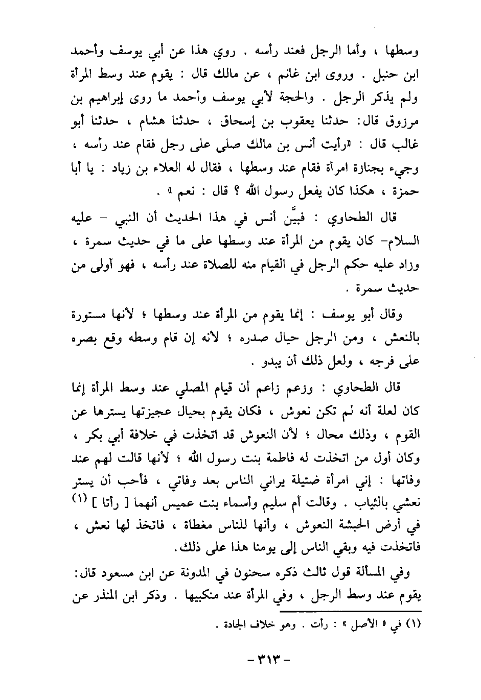 وسطها، وأما الرجل فعند رأسه. روى هذا عن أبى يوسف، وأحمد بن حنبل. وروى ابن غانم، عن مالك، قال: يقوم عند وسط المرأة ولم يذكر الرجل. والحجة لأبى يوسف، وأحمد ما روى إبراهيم بن مرزوق، قال: حدثنا يعقوب بن إسحاق، حدثنا هشام، حدثنا أبو غالب، قال: رأيت أنس بن مالك صلى على رجل فقام عند رأسه، وجىء بجنازة امرأة فقام عند وسطها، فقال له العلاء بن زياد: يا أبا حمزة، هكذا كان يفعل رسول الله؟ قال: نعم. قال الطحاوى: فبين أنس فى هذا الحديث أن النبى، (صلى الله عليه وسلم) ، كان يقوم من المرأة عند وسطها على ما فى حديث سمرة، وزاد عليه حكم الرجل فى القيام منه للصلاة عند رأسه، فهو أولى من حديث سمرة. وقال أبو يوسف: إنما يقوم من المرأة عند وسطها، لأنها مستورة بالنعش، ومن الرجل حيال صدره، لأنه إن قام وسطه وقع بصره على فرجه، ولعل ذلك أن يبدو. قال الطحاوى: وزعم زاعم أن قيام المصلى عند وسط المرأة إنما كان لعلة أنه لم تكن نعوش، فكان يقوم بحيال عجيزتها يسترها عن القوم، وذلك محال، لأن النعوش قد اتخذت فى خلافة أبى بكر، وكان أول من اتخذت له فاطمة بنت رسول الله، لأنها قالت لهم عند وفاتها: إنى امرأة ضئيلة يرانى الناس بعد وفاتى، فأحب أن يستر نعشى بالثياب. وقالت أم سليم، وأسماء بنت عميس أنهما رأتا فى أرض الحبشة النعوش، وأنها للناس مغطاة، فاتخذ لها نعش، فاتخذت فيه وبقى الناس إلى يومنا هذا على ذلك. وفى المسألة قول ثالث ذكره سحنون فى (المدونة) عن ابن مسعود، قال: يقوم عند وسط الرجل، وفى المرأة عند منكبيها. وذكر ابن المنذر عن