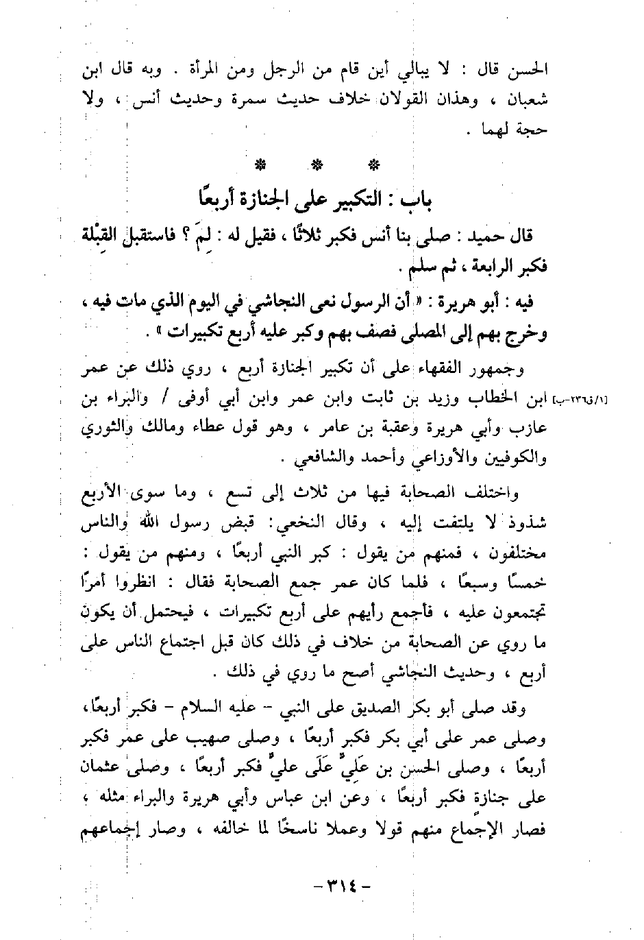 قَالَ حُمَيْدٌ: صَلَّى بِنَا أَنَسٌ فَكَبَّرَ ثَلاثًا، ثُمَّ سَلَّمَ، فَقِيلَ لَهُ: فَاسْتَقْبَلَ الْقِبْلَةَ، ثُمَّ كَبَّرَ الرَّابِعَةَ، ثُمَّ سَلَّمَ. / 68 - فيه: أَبُو هُرَيْرَةَ، أَنَّ الرسُول نَعَى النَّجَاشِىَّ فِى الْيَوْمِ الَّذِى مَاتَ فِيهِ، وَخَرَجَ بِهِمْ إِلَى الْمُصَلَّى، فَصَفَّ بِهِمْ، وَكَبَّرَ عَلَيْهِ أَرْبَعَ تَكْبِيرَاتٍ. وجمهور الفقهاء على أن تكبير الجنازة أربع، روى ذلك عن عمر بن الخطاب، وزيد ابن ثابت، وابن عمر، وابن أبى أوفى، والبراء بن عازب، وأبى هريرة، وعقبة بن عامر، وهو قول عطاء، ومالك، والثورى، والكوفيين، والأوزاعى، وأحمد، والشافعى. واختلف الصحابة فيها من ثلاث إلى تسع، وما سوى الأربع شذوذ لا يلتفت إليه، وقال النخعى: قبض رسول الله والناس مختلفون، فمنهم من يقول: كبر النبى أربعًا، ومنهم من يقول: خمسًا وسبعًا، فلما كان عمر جمع الصحابة، فقال: انظروا أمرًا تجتمعون عليه، فأجمع رأيهم على أربع تكبيرات، فيحتمل أن يكون ما روى عن الصحابة من خلاف فى ذلك كان قبل اجتماع الناس على أربع، وحديث النجاشى أصح ما روى فى ذلك. وقد صلى أبو بكر الصديق على النبى، (صلى الله عليه وسلم) ، فكبر أربعًا، وصلى عمر على أبى بكر فكبر أربعًا، وصلى صهيب على عمر فكبر أربعًا، وصلى الحسن بن علىٍّ عَلَى علىٍّ فكبر أربعًا، وصلى عثمان على جنازة فكبر أربعًا، وعن ابن عباس وأبى هريرة والبراء مثله، فصار الإجماع منهم قولاً وعملاً ناسخًا لما خالفه، وصار إجماعهم