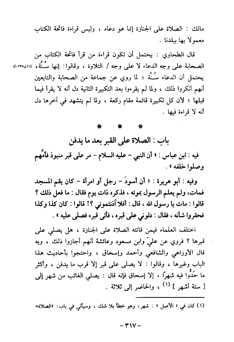مالك: الصلاة على الجنازة إنما هو دعاء، وليس قراءة فاتحة الكتاب معمولاً بها ببلدنا. قال الطحاوى: يحتمل أن تكون قراءة من قرأ فاتحة الكتاب من الصحابة على وجه الدعاء لا على وجه التلاوة، وقالوا: إنها سُنَّة، يحتمل أن الدعاء سُنَّة، لما روى عن جماعة من الصحابة والتابعين أنهم أنكروا ذلك، ولما لم يقرءوا بعد التكبيرة الثانية دل أنه لا يقرأ فيما قبلها، لأن كل تكبيرة قائمة مقام ركعة، ولما لم يتشهد فى آخرها دل أنه لا قراءة فيها.