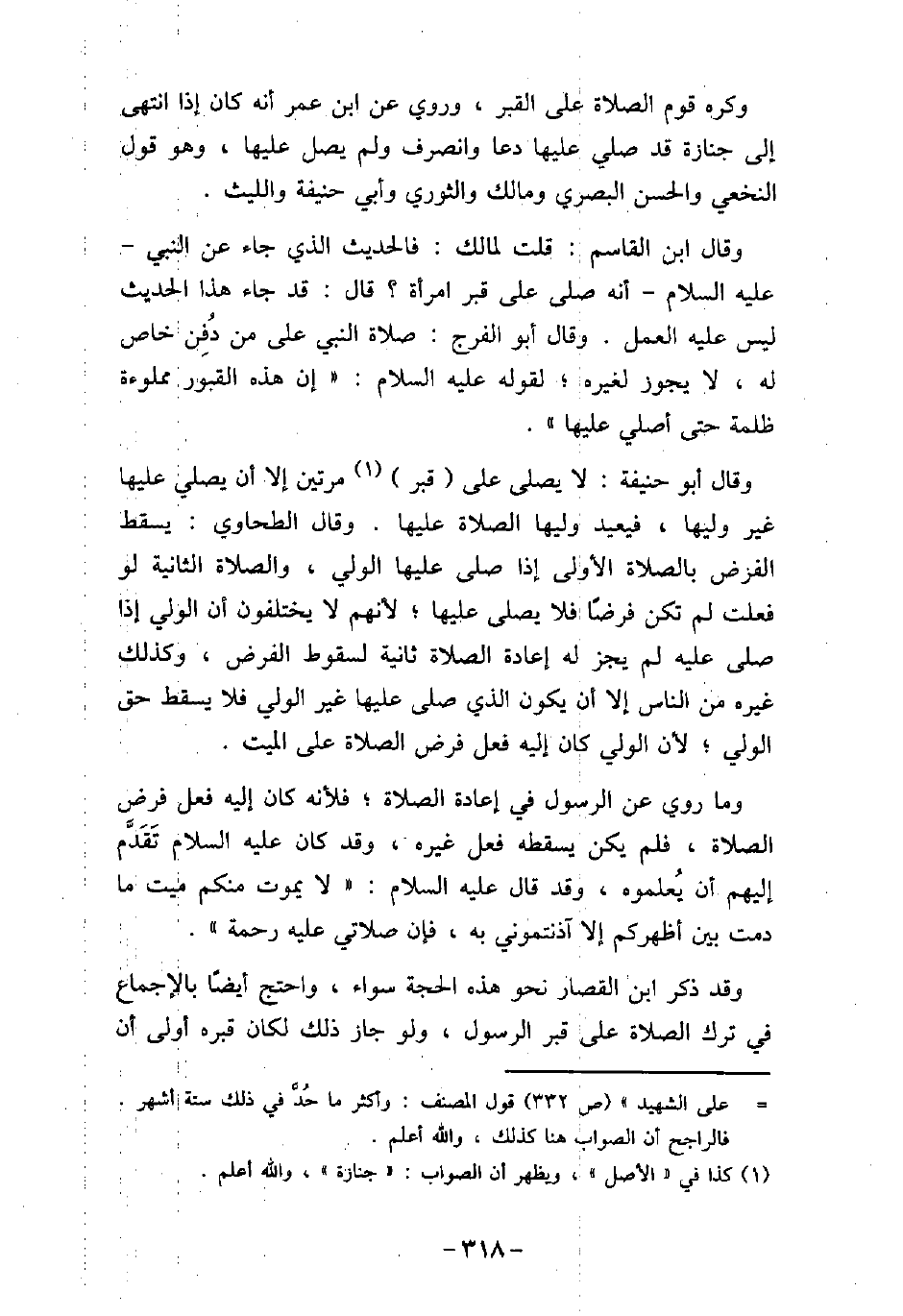 وكره قوم الصلاة على القبر، وروى عن ابن عمر أنه كان إذا انتهى إلى جنازة قد صلى عليها دعا وانصرف ولم يصل عليها، وهو قول النخعى، والحسن البصرى، ومالك، والثورى، وأبى حنيفة، والليث. وقال ابن القاسم: قلت لمالك: فالحديث الذى جاء عن النبى، (صلى الله عليه وسلم) ، أنه صلى على قبر امرأة؟ قال: قد جاء هذا الحديث ليس عليه العمل. وقال أبو الفرج: صلاة النبى على من دُفن خاص له، لا يجوز لغيره، لقوله (صلى الله عليه وسلم) : (إن هذه القبور مملوءة ظلمة حتى أصلى عليها) . وقال أبو حنيفة: لا يصلى على قبر مرتين إلا أن يصلى عليها غير وليها، فيعيد وليها الصلاة عليها. وقال الطحاوى: يسقط الفرض بالصلاة الأولى إذا صلى عليها الولى، والصلاة الثانية لو فعلت لم تكن فرضًا فلا يصلى عليها، لأنهم لا يختلفون أن الولى إذا صلى عليه لم يجز له إعادة الصلاة ثانية لسقوط الفرض، وكذلك غيره من الناس إلا أن يكون الذى صلى عليها غير الولى، فلا يسقط حق الولى، لأن الولى كان إليه فعل فرض الصلاة على الميت. وما روى عن الرسول فى إعادة الصلاة، فلأنه كان إليه فعل فرض الصلاة، فلم يكن يسقطه فعل غيره، وقد كان (صلى الله عليه وسلم) تَقَدَّم إليهم أن يُعلموا، وقد قال (صلى الله عليه وسلم) : (لا يموت منكم ميت ما دمت بين أظهركم إلا آذنتمونى به، فإن صلاتى عليه رحمة) . وقد ذكر ابن القصار نحو هذه الحجة سواء، واحتج أيضًا بالإجماع فى ترك الصلاة على قبر الرسول، ولو جاز ذلك لكان قبره أولى أن