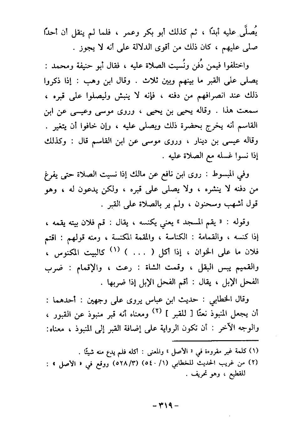 يُصلى عليه أبدًا، ثم كذلك أبو بكر وعمر، فلما لم ينقل أن أحدًا صلى عليهم، كان ذلك من أقوى الدلالة على أنه لا يجوز. واختلفوا فيمن دُفن ونُسيت الصلاة عليه، فقال أبو حنيفة ومحمد: يصلى على القبر ما بينهم وبين ثلاث. وقال ابن وهب: إذا ذكروا ذلك عند انصرافهم من دفنه، فإنه لا ينبش وليصلوا على قبره، سمعت هذا. وقاله يحيى بن يحيى، وروى موسى وعيسى، عن ابن القاسم أنه يخرج بحضرة ذلك ويصلى عليه، وإن خافوا أن يتغير. وقاله عيسى بن دينار، وروى موسى، عن ابن القاسم، قال: وكذلك إذا نسوا غسله مع الصلاة عليه. وفى المبسوط: روى ابن نافع عن مالك إذا نسيت الصلاة حتى يفرغ من دفنه لا ينشره، ولا يصلى على قبره، ولكن يدعون له، وهو قول أشهب، وسحنون، ولم ير بالصلاة على القبر. وقوله: (يقم المسجد) يعنى يكنسه، يقال: قم فلان بيته يقمه، إذا كنسه، والقمامة: الكناسة، والمقمة المكنسة، ومن قولهم: اقتم فلان ما على الخوان، إذا أكل [. . . .] كالبيت المكنوس، والقميم يبس البقل، وقمت الشاة: رعت، والإقمام: ضرب الفحل الإبل، يقال: أقم الفحل الإبل إذا ضربها. وقال الخطابى: حديث ابن عباس يروى على وجهين: أحدهما: أن يجعل المنبوذ نعتًا للقبر ومعناه أنه قبر منبوذ عن القبور، والوجه الآخر: أن تكون الرواية على إضافة القبر إلى المنبوذ، معناه: