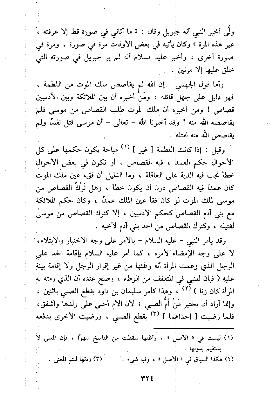 ولَّى أخبر النبى أنه جبريل، وقال: (ما أتانى فى صورة قط إلا عرفته، غير هذه المرة) . وكان يأتيه فى بعض الأوقات مرة فى صورة، ومرة فى صورة أخرى، وأخبر (صلى الله عليه وسلم) أنه لم ير جبريل فى صورته التى خلق عليها إلا مرتين. وأما قول الجهمى: إن الله لم يقاصص ملك الموت من اللطمة، فهو دليل على جهل قائله، ومن أخبره أن بين الملائكة وبين الآدميين قصاص. ومن أخبره أن ملك الموت طلب القصاص من موسى، فلم يقاصصه الله منه. وقد أخبرنا الله تعالى أن موسى قتل نفسًا ولم يقاصص الله منه لقتله. وقيل: إذا كانت اللطمة غير مباحة يكون حكمها على كل الأحوال حكم العمد، فيه القصاص، أو تكون فى بعض الأحوال خطأ تجب فيه الدية على العاقلة، وما الدليل أن فقء عين ملك الموت كان عمدًا فيه القصاص دون أن يكون خطأ، وهل تركُ القصاص من موسى لملك الموت لو كان فقأ عين الملك عمدًا، وكان حكم الملائكة مع بنى آدم القصاص كحم الآدميين، إلا كترك القصاص من موسى لقتيله، وكترك القصاص من أحد بنى آدم لأخيه. وقد يأمر النبى، (صلى الله عليه وسلم) ، بالأمر على وجه الاختبار والابتلاء، لا على وجه الإمضاء لأمره، كما أمر (صلى الله عليه وسلم) بإقامة الحد على الرجل الذى زعمت المرأة أنه وطئها من غير إقرار الرجل، ولا إقامة بينة عليه، فبان للنبى فى المتعفف من الوطء، وصح عنده أن الذى رمته به المرأة كان زنا، وهذا كأمر سليمان بن داود بقطع الصبى باثنين، وإنما أراد أن يختبر من أمُّ الصبى، لأن الأم أحنى على ولدها وأشفق، فلما رضيت إحداهما بقطع الصبى، ورضيت الأخرى بدفعه