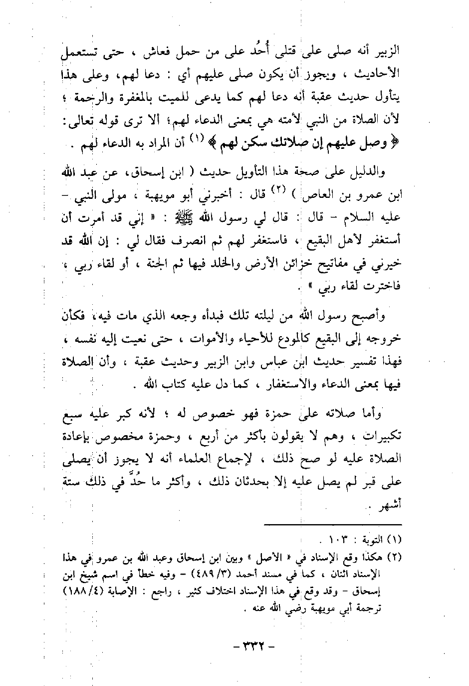 الزبير أنه صلى على قتلى أُحُد على من حمل فعاش، حتى تستعمل الأحاديث، ويجوز أن يكون صلى عليهم أى: دعا لهم، وعلى هذا يتأول حديث عقبة أنه دعا لهم كما يدعى للميت بالمغفرة والرحمة، لأن الصلاة من النبى لأمته هى بمعنى الدعاء لهم، ألا ترى قوله تعالى: (وصل عليهم إن صلاتك سكن لهم) [التوبة: 103] أن المراد به الدعاء لهم. والدليل على صحة هذا التأويل حديث ابن إسحاق، عن عبد الله بن عمرو بن العاص، قال: أخبرنى أبو مويهبة، مولى النبى، (صلى الله عليه وسلم) ، قال: قال لى رسول الله (صلى الله عليه وسلم) : (إنى قد أمرت أن أستغفر لأهل البقيع) ، فاستغفر لهم ثم انصرف، فقال لى: (إن الله قد خيرنى فى مفاتيح خزائن الأرض، والخلد فيها ثم الجنة، أو لقاء ربى، فاخترت لقاء ربى) . وأصبح رسول الله من ليلته تلك فبدأه وجعه الذى مات فيه، فكأن خروجه إلى البقيع كالمودع للأحياء والأموات، حتى نعيت إليه نفسه، فهذا تفسير حديث ابن عباس، وابن الزبير، وحديث عقبة، وأن الصلاة فيها بمعنى الدعاء والاستغفار، كما دل عليه كتاب الله. وأما صلاته على حمزة فهو خصوص له، لأنه كبر عليه سبع تكبيرت، وهم لا يقولون بأكثر من أربع، وحمزة مخصوص بإعادة الصلاة عليه لو صح ذلك، لإجماع العلماء أنه لا يجوز أن يصلى على قبر لم يصل عليه إلا بحدثان ذلك، وأكثر ما حُدَّ فى ذلك ستة أشهر.