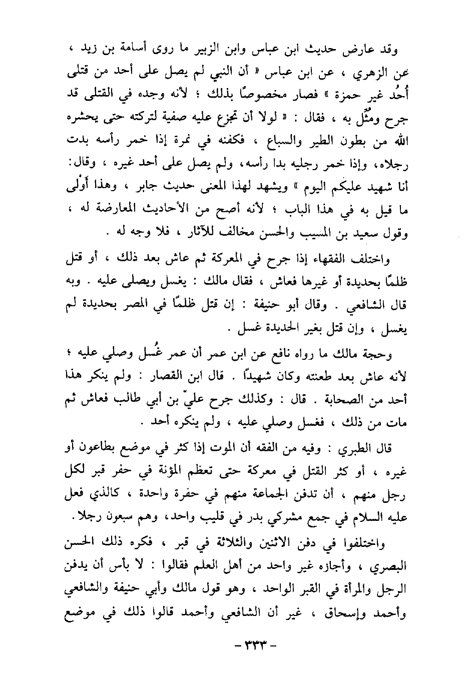 وقد عارض حديث ابن عباس، وابن الزبير، ما روى أسامة بن زيد، عن الزهرى، عن ابن عباس، (أن النبى لم يصل على أحد من قتلى أُحُد غير حمزة) . فصار مخصوصًا بذلك، لأنه وجده فى القتلى قد جرح ومُثل به، فقال: (لولا أن تجزع عليه صفية لتركته حتى يحشره الله من بطون الطير والسباع) ، فكفنه فى نمرة إذا خمر رأسه بدت رجلاه، وإذا خمر رجليه بدا رأسه، ولم يصل على أحد غيره، وقال: (أنا شهيد عليكم اليوم) . ويشهد لهذا المعنى حديث جابر، وهذا أولى ما قيل به فى هذا الباب، لأنه أصح من الأحاديث المعارضة له، وقول سعيد بن المسيب، والحسن مخالف للآثار، فلا وجه له. واختلف الفقهاء إذا جرح فى المعركة، ثم عاش بعد ذلك، أو قتل ظلمًا بحديدة، أو غيرها فعاش، فقال مالك: يغسل ويصلى عليه. وبه قال الشافعى. وقال أبو حنيفة: إن قتل ظلمًا فى المصر بحديدة لم يغسل، وإن قتل بغير الحديدة غسل. وحجة مالك ما رواه نافع، عن ابن عمر، أن عمر غُسل وصلى عليه، لأنه عاش بعد طعنته وكان شهيدًا. قال ابن القصار: ولم ينكر هذا أحد من الصحابة. قال: وكذلك جرح علىّ بن أبى طالب، فعاش ثم مات من ذلك، فغسل وصلى عليه، ولم ينكره أحد. قال الطبرى: وفيه من الفقه أن الموت إذا كثر فى موضع بطاعون أو غيره، أو كثر القتل فى معركة حتى تعظم المؤنة فى حفر قبر لكل رجل منهم، أن تدفن الجماعة منهم فى حفرة واحدة، كالذى فعل (صلى الله عليه وسلم) فى جمع مشركى بدر فى قليب واحد، وهم سبعون رجلاً. واختلفوا فى دفن الاثنين والثلاثة فى قبر، فكره ذلك الحسن البصرى، وأجازه غير واحد من أهل العلم، فقالوا: لا بأس أن يدفن الرجل والمرأة فى القبر الواحد، وهو قول مالك، وأبى حنيفة، والشافعى، وأحمد، وإسحاق، غير أن الشافعى وأحمد، قالوا ذلك فى موضع