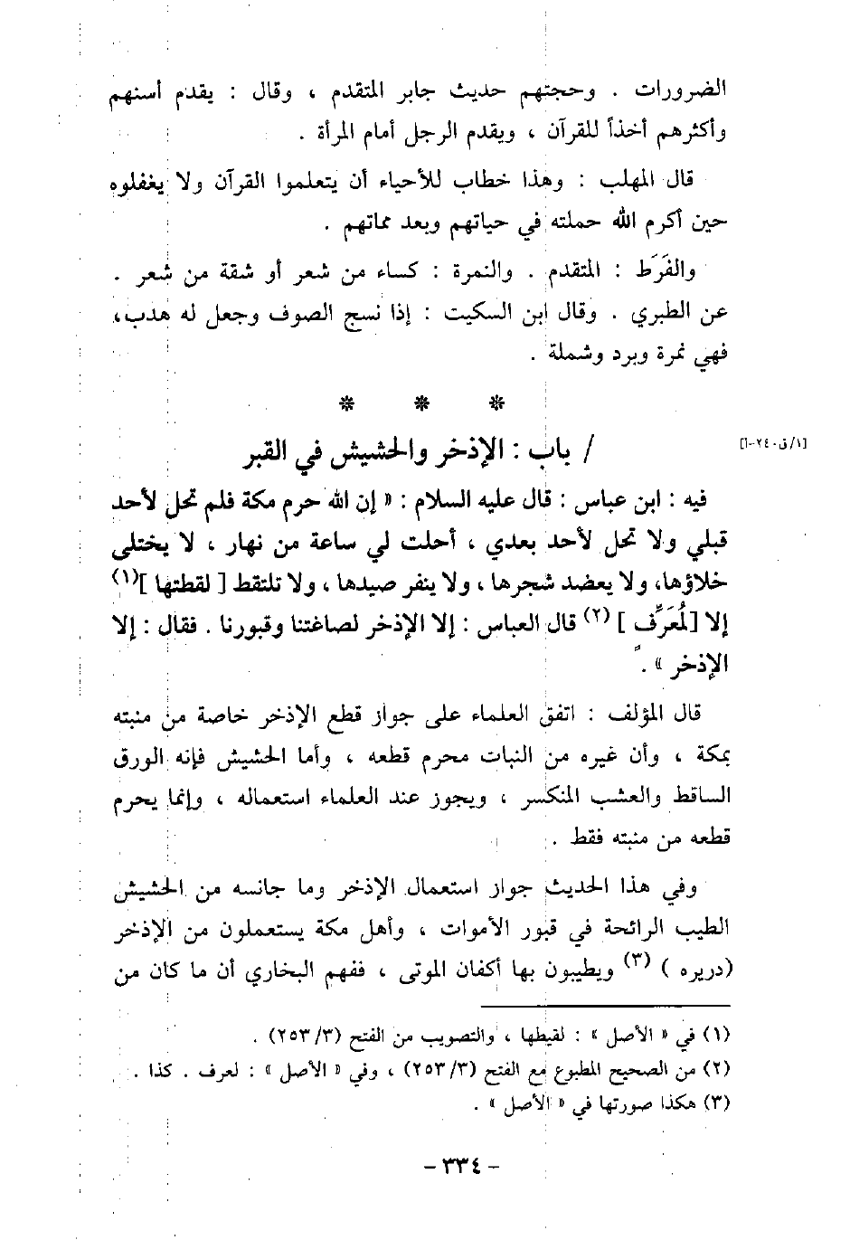 / 79 - فيه: ابْنِ عَبَّاس، قَالَ (صلى الله عليه وسلم) : (حَرَّمَ اللَّهُ مَكَّةَ، فَلَمْ تَحِلَّ لأحَدٍ قَبْلِى وَلا تَحِلَّ لأحَدٍ بَعْدِى، أُحِلَّتْ لِى سَاعَةً مِنْ نَهَارٍ، لا يُخْتَلَى خَلاهَا، وَلا يُعْضَدُ شَجَرُهَا، وَلا يُنَفَّرُ صَيْدُهَا، وَلا تُلْتَقَطُ لُقَطَتُهَا، إِلا لِمُعَرِّفٍ) ، قَالَ الْعَبَّاسُ: إِلا الإذْخِرَ لِصَاغَتِنَا وَقُبُورِنَا، فَقَالَ: (إِلا الإذْخِرَ) . قال المؤلف: اتفق العلماء على جواز قطع الإذخر خاصة من منبته بمكة، وأن غيره من النبات محرم قطعه، وأما الحشيش فإنه الورق الساقط والعشب المنكسر، ويجوز عند العلماء استعماله، وإنما يحرم قطعه من منبته فقط. وفى هذا الحديث جواز استعمال الإذخر وما جانسه من الحشيش الطيب الرائحة فى قبور الأموات، وأهل مكة يستعملون من الإذخر دريره ويطيبون بها أكفان الموتى، ففهم البخارى أن ما كان من
