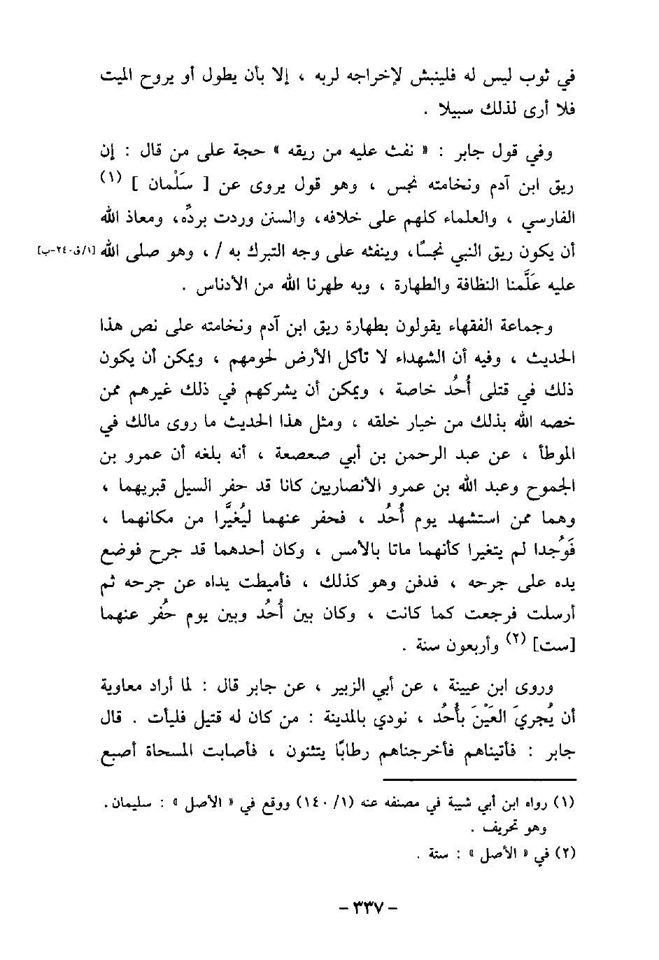 فى ثوب ليس له فلينبش لإخراجه لربه، إلا بأن يطول أو يروح الميت فلا أرى لذلك سبيلاً. وفى قول جابر: (نفث عليه من ريقه) حجة على من قال: إن ريق ابن آدم ونخامته نجس، وهو قول يروى عن سلمان الفارسى، والعلماء كلهم على خلافه، والسنن وردت بردِّه، ومعاذ الله أن يكون ريق النبى نجسًا، وينفثه على وجه التبرك به، وهو صلى الله عليه عَلَّمنا النظافة والطهارة، وبه طهرنا الله من الأدناس. وجماعة الفقهاء يقولون بطهارة ريق ابن آدم ونخامته على نص هذا الحديث، وفيه أن الشهداء لا تأكل الأرض لحومهم، ويمكن أن يكون ذلك فى قتلى أُحُد خاصة، ويمكن أن يشركهم فى ذلك غيرهم ممن خصه الله بذلك من خيار خلقه، ومثل هذا الحديث ما روى مالك فى الموطأ، عن عبد الرحمن بن أبى صعصعة، أنه بلغه أن عمرو بن الجموح، وعبد الله بن عمرو الأنصاريين كانا قد حفر السيل قبريهما، وهما ممن استشهد يوم أُحُد، فحفر عنهما ليُغيَّرا من مكانهما، فَوُجدا لم يتغيرا كأنهما ماتا بالأمس، وكان أحدهما قد جرح فوضع يده على جرحه، فدفن وهو كذلك، فأميطت يداه عن جرحه، ثم أرسلت فرجعت كما كانت، وكان بين أُحُد وبين يوم حُفر عنهما ست وأربعون سنة. وروى ابن عيينة، عن أبى الزبير، عن جابر، قال: لما أراد معاوية أن يُجرىَ العَيْنَ بأُحُد، نودى بالمدينة: من كان له قتيل فليأت. قال جابر: فأتيناهم فأخرجناهم رطابًا يتثنون، فأصابت المسحاة أصبع
