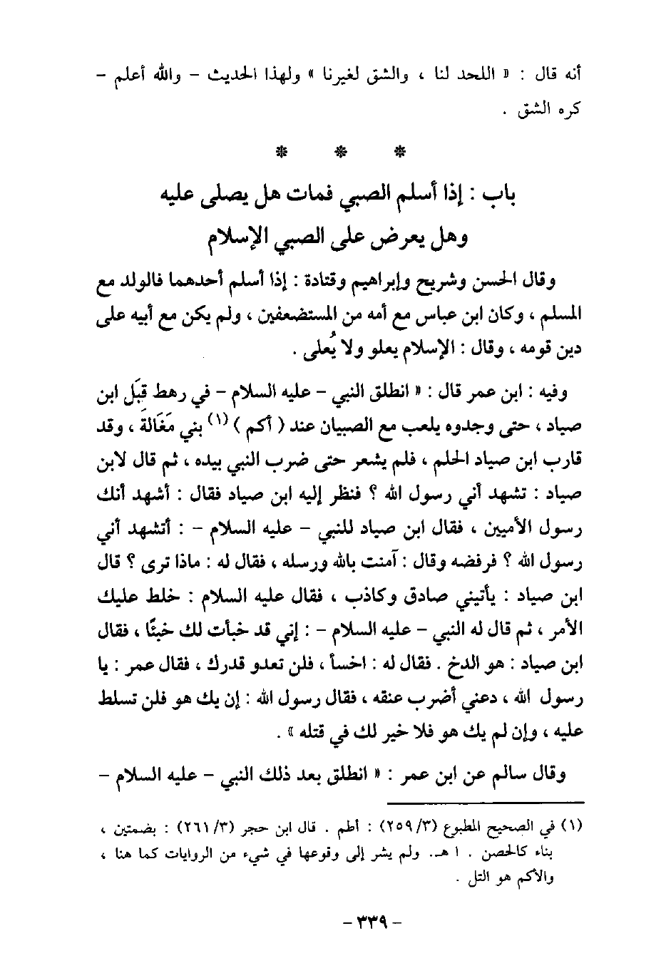 وَقَالَ الْحَسَنُ وَشُرَيْحٌ وَإِبْرَاهِيمُ وَقَتَادَةُ: إِذَا أَسْلَمَ أَحَدُهُمَا، فَالْوَلَدُ مَعَ الْمُسْلِمِ، وَكَانَ ابْنُ عَبَّاسٍ مَعَ أُمِّهِ مِنَ الْمُسْتَضْعَفِينَ، وَلَمْ يَكُنْ مَعَ أَبِيهِ عَلَى دِينِ قَوْمِهِ، وَقَالَ: الإسْلامُ يَعْلُو وَلا يُعْلَى. / 83 - فيه: ابْن عُمَر، قال: انْطَلَقَ النَّبِىِّ، (صلى الله عليه وسلم) ، فِى رَهْطٍ قِبَلَ ابْنِ صَيَّادٍ، حَتَّى وَجَدُوهُ يَلْعَبُ مَعَ الصِّبْيَانِ، عِنْدَ أُكُمِ بَنِى مَغَالَةَ، وَقَدْ قَارَبَ ابْنُ صَيَّادٍ الْحُلُمَ، فَلَمْ يَشْعُرْ حَتَّى ضَرَبَ النَّبِىُّ (صلى الله عليه وسلم) بِيَدِهِ، ثُمَّ قَالَ لابْنِ صَيَّادٍ: (تَشْهَدُ أَنِّى رَسُولُ اللَّهِ) ؟ فَنَظَرَ إِلَيْهِ ابْنُ صَيَّادٍ، فَقَالَ: أَشْهَدُ أَنَّكَ رَسُولُ الأمِّيِّينَ، فَقَالَ ابْنُ صَيَّادٍ لِلنَّبِىِّ (صلى الله عليه وسلم) : أَتَشْهَدُ أَنِّى رَسُولُ اللَّهِ؟ فَرَفَضَهُ، وَقَالَ: آمَنْتُ بِاللَّهِ وَبِرُسُلِهِ، فَقَالَ لَهُ: (مَاذَا تَرَى؟) قَالَ ابْنُ صَيَّادٍ: يَأْتِينِى صَادِقٌ وَكَاذِبٌ، فَقَالَ (صلى الله عليه وسلم) : (خُلِّطَ عَلَيْكَ الأمْرُ) ، ثُمَّ قَالَ لَهُ النَّبِىُّ (صلى الله عليه وسلم) : (إِنِّى قَدْ خَبَأْتُ لَكَ خَبِيئًا) ، فَقَالَ ابْنُ صَيَّادٍ: هُوَ الدُّخُّ، فَقَالَ: (اخْسَأْ، فَلَنْ تَعْدُوَ قَدْرَكَ) ، فَقَالَ عُمَرُ: يَا رَسُولَ اللَّهِ دَعْنِى أَضْرِبْ عُنُقَهُ، فَقَالَ رسول الله: (إِنْ يَكُنْهُ فَلَنْ تُسَلَّطَ عَلَيْهِ، وَإِنْ لَمْ يَكُنْهُ فَلا خَيْرَ لَكَ فِى قَتْلِهِ) . وَقَالَ سَالِمٌ، عن ابْنَ عُمَر: انْطَلَقَ بَعْدَ ذَلِكَ النّبِىَ، - عليه السلام -،