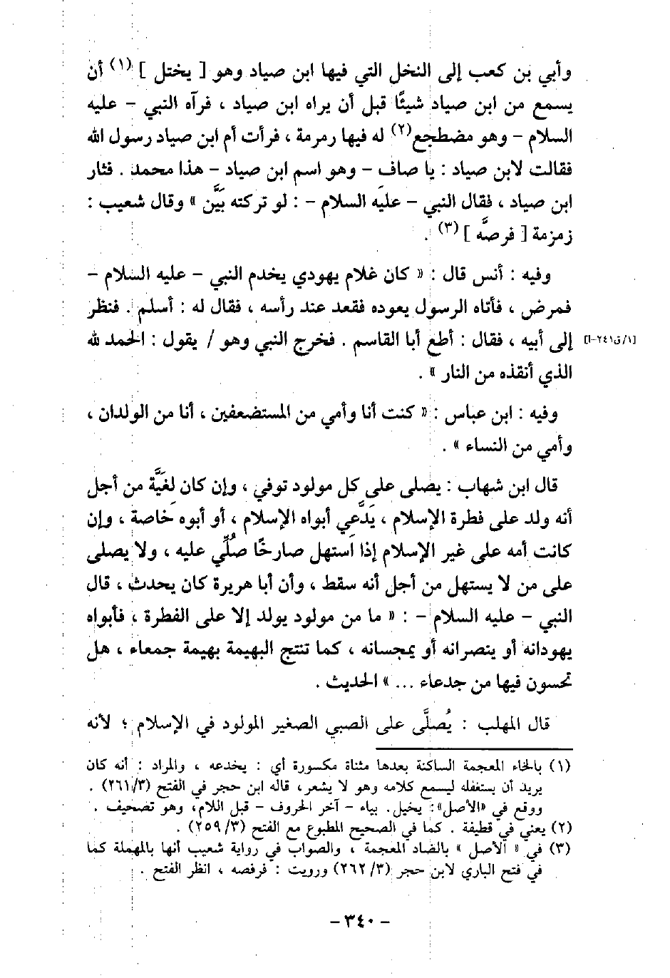 وَأُبَىُّ بْنُ كَعْبٍ إِلَى النَّخْلِ الَّتِى فِيهَا ابْنُ صَيَّادٍ، وَهُوَ يَخْتِلُ أَنْ يَسْمَعَ مِنِ ابْنِ صَيَّادٍ شَيْئًا قَبْلَ أَنْ يَرَاهُ ابْنُ صَيَّادٍ، فَرَآهُ النَّبِىُّ، (صلى الله عليه وسلم) ، وَهُوَ مُضْطَجِعٌ -[يَعْنِى فِى قَطِيفَةٍ] لَهُ - فِيهَا رَمْرَمةٌ، فَرَأَتْ أمُّ ابْنِ صَيّادٍ رَسُولَ اللَّهِ، فَقَالَتْ لابْنِ صَيَّادٍ: يَا صَافِ - وَهُوَ اسْمُ ابْنِ صَيَّادٍ - هَذَا مُحَمَّدٌ، فَثَارَ ابْنُ صَيَّادٍ، فَقَالَ النَّبِىُّ (صلى الله عليه وسلم) : (لَوْ تَرَكَتْهُ بَيَّنَ) ، وَقَالَ شُعَيْبٌ: رَمْرَمَةٌ فَرَصَهُ. / 84 - وفيه: أَنَس، قَالَ: كَانَ غُلامٌ يَهُودِىٌّ يَخْدُمُ النَّبِىَّ، (صلى الله عليه وسلم) ، فَمَرِضَ، فَأَتَاهُ الرسول يَعُودُهُ، فَقَعَدَ عِنْدَ رَأْسِهِ فَقَالَ لَهُ: (أَسْلِمْ) ، فَنَظَرَ إِلَى أَبِيهِ، وَهُوَ عِنْدَهُ، فَقَالَ لَهُ: أَطِعْ أَبَا الْقَاسِمِ، فَخَرَجَ النَّبِىُّ (صلى الله عليه وسلم) ، وَهُوَ يَقُولُ: (الْحَمْدُ لِلَّهِ الَّذِى أَنْقَذَهُ مِنَ النَّارِ) . / 85 - وفيه: ابْنَ عَبَّاس، كُنْتُ أَنَا وَأُمِّى مِنَ الْمُسْتَضْعَفِينَ، أَنَا مِنَ الْوِلْدَانِ، وَأُمِّى مِنَ النِّسَاءِ. قَالَ ابْنُ شِهَابٍ: يُصَلَّى عَلَى كُلِّ مَوْلُودٍ مُتَوَفًّى، وَإِنْ كَانَ لِغَيَّةٍ مِنْ أَجْلِ أَنَّهُ وُلِدَ عَلَى فِطْرَةِ الإسْلامِ، يَدَّعِى أَبَوَاهُ الإسْلام، َ أَوْ أَبُوهُ خَاصَّةً، وَإِنْ كَانَتْ أُمُّهُ عَلَى غَيْرِ الإسْلامِ، إِذَا اسْتَهَلَّ صَارِخًا صُلِّىَ عَلَيْهِ، وَلا يُصَلَّى عَلَى مَنْ لا يَسْتَهِلُّ، مِنْ أَجْلِ أَنَّهُ سِقْطٌ، وَإِنَّ أَبَا هُرَيْرَةَ كَانَ يُحَدِّثُ، قَالَ النَّبِىُّ (صلى الله عليه وسلم) : (مَا مِنْ مَوْلُودٍ إِلا يُولَدُ عَلَى الْفِطْرَةِ، فَأَبَوَاهُ يُهَوِّدَانِهِ، أَوْ يُنَصِّرَانِهِ، أَوْ يُمَجِّسَانِهِ، كَمَا تُنْتَجُ الْبَهِيمَةُ بَهِيمَةً جَمْعَاءَ، هَلْ تُحِسُّونَ فِيهَا مِنْ جَدْعَاءَ. . . .) الحديث. قال المهلب: يُصلى على الصبى الصغير المولود فى الإسلام، لأنه