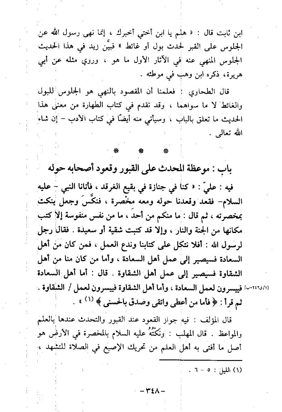 / 88 - فيه: عَلِىٍّ كُنَّا فِي جَنَازَةٍ فِي بَقِيعِ الْغَرْقَدِ، فَأَتَانَا النَّبِىُّ (صلى الله عليه وسلم) ، فَقَعَدَ، وَقَعَدْنَا حَوْلَهُ، وَمَعَهُ مِخْصَرَةٌ، فَنَكَّسَ، وَجَعَلَ يَنْكُتُ بِمِخْصَرَتِهِ، ثُمَّ قَالَ: (مَا مِنْكُمْ مِنْ أَحَدٍ مَا مِنْ نَفْسٍ مَنْفُوسَةٍ إِلا كُتِبَ مَكَانُهَا مِنَ الْجَنَّةِ وَالنَّارِ، وَإِلا قَدْ كُتِبَتْ شَقِيَّةً أَوْ سَعِيدَةً) ، فَقَالَ رَجُلٌ لرَسُولَ اللَّهِ: أَفَلا نَتَّكِلُ عَلَى كِتَابِنَا، وَنَدَعُ الْعَمَلَ، فَمَنْ كَانَ مِنْ أَهْلِ السَّعَادَةِ فَسَيَصِيرُ إِلَى عَمَلِ أَهْلِ السَّعَادَةِ، وَأَمَّا مَنْ كَانَ مِنَّا مِنْ أَهْلِ الشَّقَاوَةِ فَسَيَصِيرُ إِلَى عَمَلِ أَهْلِ الشَّقَاوَةِ، قَالَ: (أَمَّا أَهْلُ السَّعَادَةِ فَيُيَسَّرُونَ لِعَمَلِ السَّعَادَةِ، وَأَمَّا أَهْلُ الشَّقَاوَةِ فَيُيَسَّرُونَ لِعَمَلِ الشَّقَاوَةِ، ثُمَّ قَرَأَ: (فَأَمَّا مَنْ أَعْطَى وَاتَّقَى وَصَدَّقَ بِالْحُسْنَى (الآيَةَ) . قال المؤلف: فيه جواز القعود عند القبور والتحدث عندها بالعلم والمواعظ. قال المهلب: ونَكْتُهُ (صلى الله عليه وسلم) بالمخصرة فى الأرض هو أصل ما أفتى به أهل العلم من تحريك الإصبع فى الصلاة للتشهد،