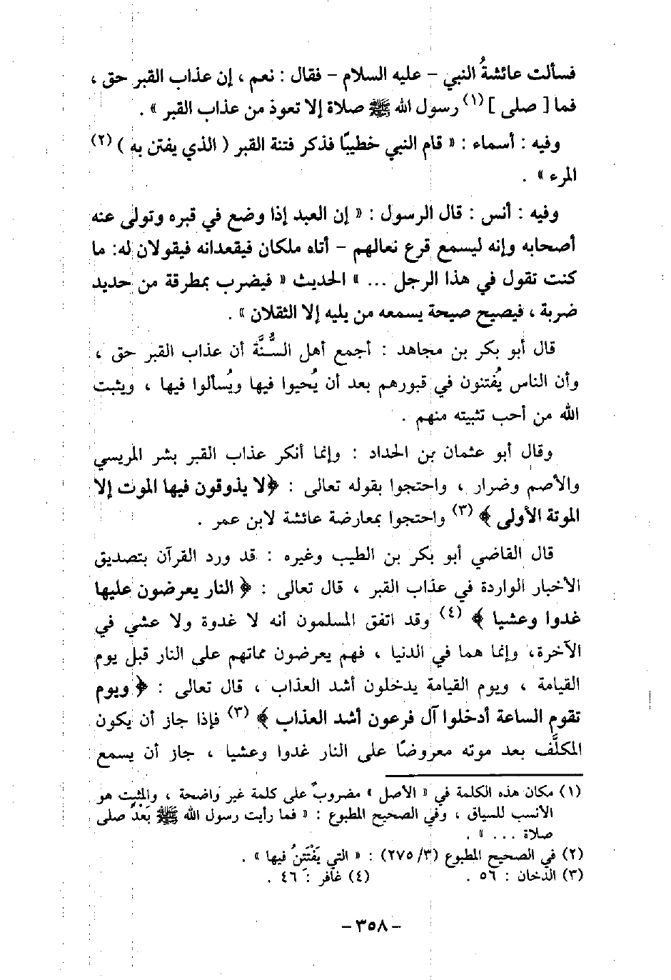 فَسَأَلَتْ عَائِشَةُ النّبِىّ، (صلى الله عليه وسلم) ، فَقَالَ: (نَعَمْ، عَذَابُ الْقَبْرِ حَقٌّ) ، فَمَا صَلَّى رسول الله (صلى الله عليه وسلم) صَلاةً إِلا تَعَوَّذَ مِنْ عَذَابِ الْقَبْرِ. / 97 - وفيه: أَسْمَاءَ، قَامَ النّبِىّ خَطِيبًا، فَذَكَرَ فِتْنَةَ الْقَبْرِ الذِّى يَفْتَتِنُ به الْمَرْءُ. / 98 - وفيه: أَنَس، قَالَ الرَسُول: (إِنَّ الْعَبْدَ إِذَا وُضِعَ فِى قَبْرِهِ وَتَوَلَّى عَنْهُ أَصْحَابُهُ، وَإِنَّهُ لَيَسْمَعُ قَرْعَ نِعَالِهِمْ، أَتَاهُ مَلَكَان، ِ فَيُقْعِدَانِهِ فَيَقُولانِ له: مَا كُنْتَ تَقُولُ فِى هَذَا الرَّجُلِ. . . .) ؟ الحديث (فَيُضْرَبُ بِمَطَرِقَة مِنْ حَدِيدٍ ضَرْبَةً، فَيَصِيحُ صَيْحَةً يَسْمَعُهَا مَنْ يَلِيهِ إلا الثَّقَلَيْنِ) . قال أبو بكر بن مجاهد: أجمع أهل السُّنَّة أن عذاب القبر حق، وأن الناس يُفتنون فى قبورهم بعد أن يُحيوا فيها ويُسألوا فيها، ويثبت الله من أحب تثبيته منهم. وقال أبو عثمان بن الحداد: وإنما أنكر عذاب القبر بشر المريسى والأصم وضرار، واحتجوا بقوله تعالى: (لا يذوقون فيها الموت إلا الموتة الأولى) [الدخان: 56] واحتجوا بمعارضة عائشة لابن عمر. قال القاضى أبو بكر بن الطيب وغيره: قد ورد القرآن بتصديق الأخبار الواردة فى عذاب القبر، قال تعالى: (النار يعرضون عليها غدوا وعشيا) [غافر: 46] وقد اتفق المسلمون أنه لا غدوة ولا عشى فى الآخرة، وإنما هما فى الدنيا، فهم يعرضون مماتهم على النار قبل يوم القيامة، ويوم القيامة يدخلون أشد العذاب، قال تعالى: (ويوم تقوم الساعة أدخلوا آل فرعون أشد العذاب) [غافر: 46] ، فإذا جاز أن يكون المكلَّف بعد موته معروضًا على النار غدوا وعشيًا، جاز أن يسمع