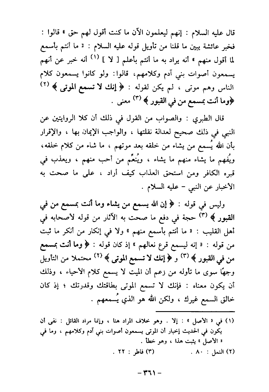 قال عليه السلام: إنهم ليعلمون الآن ما كنت أقول لهم الحق. قالوا: فخبر عائشة بين ما قلنا من تأويل قوله (صلى الله عليه وسلم) : ما أنتم بأسمع لما أقول منهم. أنه يراد به ما أنتم بأعلم لا أنه خبر عن أنهم يسمعون أصوات بنى آدم وكلامهم، قالوا: ولو كانوا يسمعون كلام الناس وهم موتى، لم يكن لقوله: (إنك لا تسمع الموتى) [النمل: 80] ) وما أنت بمسمع من فى القبور) [فاطر: 22] معنى. قال الطبرى: والصواب من القول فى ذلك أن كلا الروايتين عن النبى فى ذلك صحيح لعدالة نقلتها، والواجب الإيمان بها، والإقرار بأن الله يُسمع من يشاء من خلقه بعد موتهم، ما شاء من كلام خلقه، ويُفهم ما يشاء منهم ما يشاء، ويُنعِّم من أحب منهم، ويعذب فى قبره الكافر، ومن استحق العذاب كيف أراد، على ما صحت به الأخبار عن النبى، (صلى الله عليه وسلم) . وليس فى قوله: (إن الله يسمع من يشاء وما أنت بمسمع من فى القبور) [فاطر: 22] ، حجة فى دفع ما صحت به الآثار من قوله لأصحابه فى أهل القليب: (ما أنتم بأسمع منهم) ، ولا فى إنكار من أنكر ما ثبت من قوله: (إنه ليسمع قرع نعالهم) إذا كان قوله: (وما أنت بمسمع من فى القبور) [فاطر: 22] ، و) إنك لا تسمع الموتى) [النمل: 80] محتملاً من التأويل وجهًا سوى ما تأوله من زعم أن الميت لا يسمع كلام الأحياء، وذلك أن يكون معناه: فإنك لا تسمع الموتى بطاقتك وقدرتك، إذ كان خالق السمع غيرك، ولكن الله هو الذى يُسمعهم.