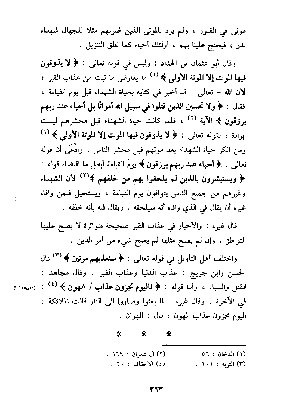 موتى فى القبور، ولم يرد بالموتى الذين ضربهم مثلاً للجهال شهداء بدر، فيحتج علينا بهم، أولئك أحياء كما نطق التنزيل. وقال أبو عثمان بن الحداد: وليس فى قوله تعالى: (لا يذقون فيها الموت إلا الموتة الأولى) [الدخان: 56] ما يعارض ما ثبت من عذاب القبر، فقال: (ولا تحسبن الذين قتلوا فى سبيل الله أمواتًا بل أحياء عند ربهم يرزقون) [آل عمران: 169] الآية، فلما كانت حياة الشهداء قبل محشرهم ليست برادة، لقوله تعالى: (لا يذوقون فيها الموت إلا الموتة الأولى) [الدخان: 56] ومن أنكر حياة الشهداء بعد موتهم قبل محشر الناس، وادعى أن قوله تعالى: (أحياء عند ربهم يرزقون) [آل عمران: 169] يوم القيامة أبطل ما اقتضاه قوله: (ويستبشرون بالذين لم يلحقوا بهم من خلفهم) [آل عمران: 169] لأن الشهداء وغيرهم من جميع الناس يتوافون يوم القيامة، ويستحيل فيمن وافاه غيره أن يقال فى الذى وافاه أنه سيلحقه، ويقال فيه بأنه خلفه. قال غيره: والأخبار فى عذاب القبر صحيحة متواترة لا يصح عليها التواطؤ، وإن لم يصح مثلها لم يصح شىء من أمر الدين. واختلف أهل التأويل فى قوله تعالى: (سنعذبهم مرتين) [التوبة: 101] ، قال الحسن، وابن جريج: عذاب الدنيا وعذاب القبر، وقال مجاهد: القتل والسباء، وأما قوله: (فاليوم تجزون عذاب الهون) [الأحقاف: 20] فى الآخرة. وقال غيره: لما بعثوا وصاروا إلى النار قالت الملائكة: اليوم تجزون عذاب الهون، قال: الهوان.