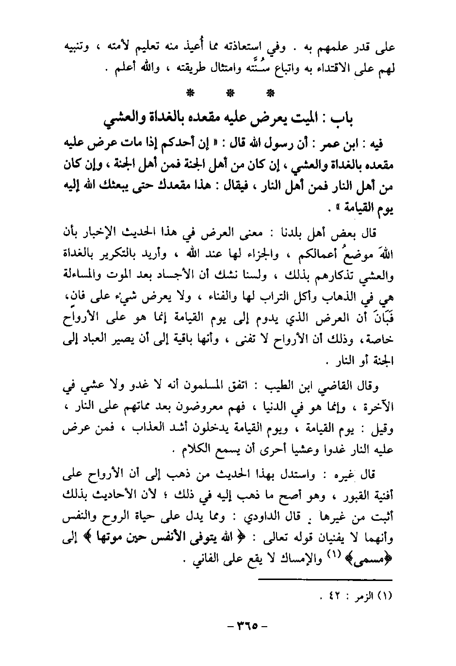/ 102 - فيه: ابْن عُمَر، أَنَّ رَسُولَ اللَّهِ (صلى الله عليه وسلم) قَالَ: (إِنَّ أَحَدَكُمْ إِذَا مَاتَ عُرِضَ عَلَيْهِ مَقْعَدُهُ بِالْغَدَاةِ وَالْعَشِىِّ، إِنْ كَانَ مِنْ أَهْلِ الْجَنَّةِ فَمِنْ أَهْلِ الْجَنَّةِ، وَإِنْ كَانَ مِنْ أَهْلِ النَّارِ فَمِنْ أَهْلِ النَّارِ، فَيُقَالُ: هَذَا مَقْعَدُكَ حَتَّى يَبْعَثَكَ اللَّهُ يَوْمَ الْقِيَامَةِ) . قال بعض أهل بلدنا: معنى العرض فى هذا الحديث الإخبار بأن الله موضعُ أعمالكم، والجزاء لها عند الله، وأريد بالتكرير بالغداة والعشى تذكارهم بذلك، ولسنا نشك أن الأجساد بعد الموت والمساءلة هى فى الذهاب وأكل التراب لها والفناء، ولا يعرض شىء على فانٍ، فَبَانَ أن العرض الذى يدوم إلى يوم القيامة إنما هو على الأرواح خاصة، وذلك أن الأرواح لا تفنى، وأنها باقية إلى أن يصير العباد إلى الجنة أو النار. وقال القاضى ابن الطيب: اتفق المسلمون أنه لا غدو ولا عشى فى الآخرة، وإنما هو فى الدنيا، فهم معروضون بعد مماتهم على النار، وقيل: يوم القيامة، ويوم القيامة يدخلون أشد العذاب، فمن عرض عليه النار غدوًا وعشيًا أحرى أن يسمع الكلام. قال غيره: واستدل بهذا الحديث من ذهب إلى أن الأرواح على أفنية القبور، وهو أصح ما ذهب إليه فى ذلك، لأن الأحاديث بذلك أثبت من غيرها. قال الداودى: ومما يدل على حياة الروح والنفس، وأنهما لا يفنيان قوله تعالى: (الله يتوفى الأنفس حين موتها (إلى) مسمى) [الزمر: 42] ، والإمساك لا يقع على الفانى.