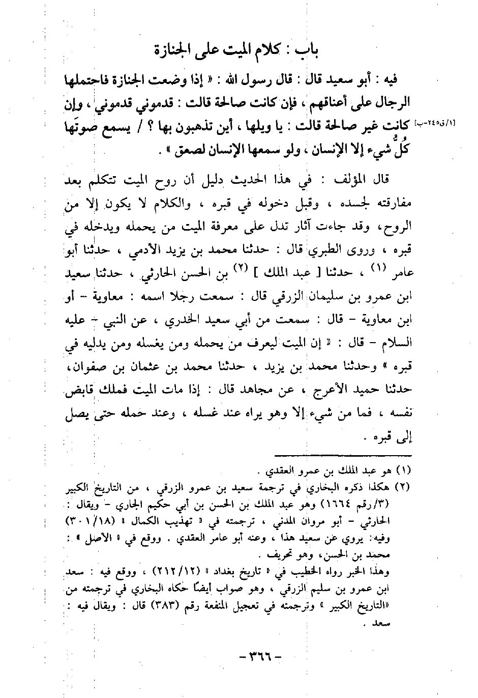 / 103 - فيه: أَبُو سَعِيد، قَالَ: قَالَ رَسُولُ اللَّهِ (صلى الله عليه وسلم) : (إِذَا وُضِعَتِ الْجِنَازَةُ، فَاحْتَمَلَهَا الرِّجَالُ عَلَى أَعْنَاقِهِمْ، فَإِنْ كَانَتْ صَالِحَةً، قَالَتْ: قَدِّمُونِى، قَدِّمُونِى، وَإِنْ كَانَتْ غَيْرَ صَالِحَةٍ، قَالَتْ: يَا وَيْلَهَا، أَيْنَ تَذْهَبُونَ بِهَا؟ يَسْمَعُ صَوْتَهَا كُلُّ شَىْءٍ إِلا الإنْسَانَ، وَلَوْ سَمِعَهَا الإنْسَانُ لَصَعِقَ) . قال المؤلف: فى هذا الحديث دليل أن روح الميت تتكلم بعد مفارقته لجسده، وقبل دخوله فى قبره، والكلام لا يكون إلا من الروح، وقد جاءت آثار تدل على معرفة الميت من يحمله ويدخله فى قبره، وروى الطبرى، قال: حدثنا محمد بن يزيد الأدمى، حدثنا أبو عامر، حدثنا عبد الملك بن الحسن الحارثى، حدثنا سعيد بن عمرو بن سليمان الزرقى، قال: سمعت رجلاً اسمه معاوية، أو ابن معاوية، قال: سمعت من أبى سعيد الخدرى، عن النبى، (صلى الله عليه وسلم) ، قال: (إن الميت ليعرف من يحمله ومن يغسله ومن يدليه فى قبره) . وحدثنا محمد بن يزيد، حدثنا محمد بن عثمان بن صفوان، حدثنا حميد الأعرج، عن مجاهد، قال: إذا مات الميت فملك قابض نفسه، فما من شىء إلا وهو يراه عند غسله، وعند حمله حتى يصل إلى قبره.