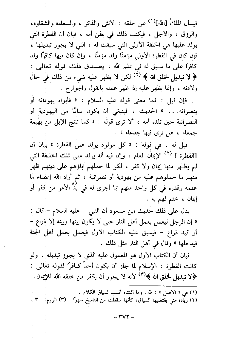 فيسأل الملكُ الله عن خلقه: الأنثى والذكر، والسعادة والشقاوة، والرزق والأجل، فيكتب ذلك فى بطن أمه، فبان أن الفطرة التى يولد عليها هى الخلقة الأولى التى سبقت له، التى لا يجوز تبديلها، فإن كان فى الفطرة الأولى مؤمنًا ولد مؤمنًا، وإن كان فيها كافرًا ولد كافرًا على ما سبق له فى علم الله، يصدق ذلك قوله تعالى: (لا تبديل لخلق الله) [الروم: 30] لكن لا يظهر عليه شىء من ذلك فى حال ولادته، وإنما يظهر عليه إذا ظهر عمله بالقول والجوارح. فإن قيل: فما معنى قوله (صلى الله عليه وسلم) : (فأبواه يهودانه، أو ينصرانه. . .) الحديث، فينبغى أن يكون سالمًا من اليهودية، أو النصرانية حين تلده أمه، ألا ترى قوله: (كما تنتج الإبل من بهيمة جمعاء، هل ترى فيها جدعاء) . قيل له: فى قوله: (كل مولود يولد على الفطرة) بيان أن الفطرة الإيمان العام، وإنما فيه أنه يولد على تلك الخلقة التى لم يظهر منها إيمان ولا كفر، لكن لما حملهم آباؤهم على دينهم ظهر منهم ما حملوهم عليه من يهودية أو نصرانية، ثم أراد الله إمضاء ما علمه وقدره فى كل واحد منهم بما أجرى له فى بُدِّ الأمر من كفر، أو إيمان، ختم لهم به. يدل على ذلك حديث ابن مسعود أن النبى، (صلى الله عليه وسلم) ، قال: (إن الرجل ليعمل بعمل أهل النار، حتى لا يكون بينها وبينه إلا ذراع، أو قيد ذراع، فيسبق عليه الكتاب الأول فيعمل بعمل أهل الجنة فيدخلها) . وقال فى أهل النار مثل ذلك. فبان أن الكتاب الأول هو المعمول عليه الذى لا يجوز تبديله، ولو كانت الفطرة: الإسلام لما جاز أن يكون أحدٌ كافرًا لقوله تعالى: (لا تبديل لخلق الله) [الروم: 30] لأنه لا يجوز أن يكفر من خلقه الله للإيمان.