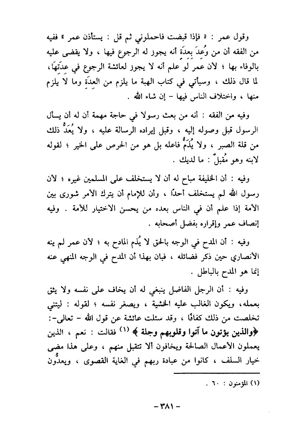 وقول عمر: (فإذا قبضت فاحملونى، ثم قل: يستأذن عمر) ، ففبه من الفقه: أن من وُعِدَ أنه يجوز له الرجوع فيها، ولا يقضى عليه بالوفاء بها، لأن عمر لو علم أنه لا يجوز لعائشة الرجوع فى عدتها، لما قال ذلك، وسيأتى فى كتاب الهبة ما يلزم من العدة وما لا يلزم منها، واختلاف الناس فيها، إن شاء الله. وفيه من الفقه: أنه من بعث رسولاً فى حاجة مهمة أن له أن يسأل الرسول قبل وصوله إليه، وقبل إيراده الرسالة عليه، ولا يُعدُّ ذلك من قلة الصبر، ولا يُذُّم فاعله بل هو من الحرص على الخير، لقوله لابنه وهو مُقبلٌ: ما لديك. وفيه: أن الخليفة مباح له أن لا يستخلف على المسلمين غيره، لأن رسول الله لم يستخلف أحدًا، وأن للإمام أن يترك الأمر شورى بين الأمة إذا علم أن فى الناس بعده من يحسن الاختيار للأمة. وفيه: إنصاف عمر وإقراره بفضل أصحابه. وفيه: أن المدح فى الوجه بالحق لا يُذم المادح به، لأن عمر لم ينه الأنصارى حين ذكر فضائله، فبان بهذا أن المدح فى الوجه المنهى عنه إنما هو المدح بالباطل. وفيه: أن الرجل الفاضل ينبغى له أن يخاف على نفسه ولا يثق بعمله، ويكون الغالب عليه الخشية، ويصغر نفسه، لقوله: ليتنى تخلصت من ذلك كفافًا، وقد سئلت عائشة عن قول الله تعالى: (والذين يؤتون ما آتوا وقلوبهم وجلة) [المؤمنون: 60] ، فقالت: نعم، الذين يعملون الأعمال الصالحة ويخافون ألا تتقبل منهم، وعلى هذا مضى خيار السلف، كانوا من عبادة ربهم فى الغاية القصوى، ويعدُّون