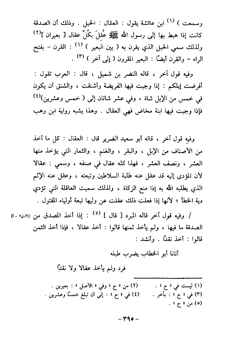 وسمعت ابن عائشة يقول: العقال: الحبل. وذلك أن الصدقة كانت إذا هبط بها إلى رسول الله (صلى الله عليه وسلم) عُقِلَ بكُلِّ عقال بعيران، ولذلك سمى الحبل الذى يقرن به بين البعير: القرن، بفتح الراء، والقرن أيضًا: البعير المقرون إلى آخر. وفيه قول آخر، قاله النضر بن شميل، قال: العرب تقول: أفرضت إبلكم: إذا وجبت فيها الفريضة وأشنقت، والشنق أن يكون فى خمس من الإبل شاة، وفى عشر شاتان إلى خمس وعشرين، فإذا وجبت فيها ابنة مخاض فهى العقال. وهذا يشبه رواية ابن وهب. وفيه قول آخر، قاله أبو سعيد الضرير، قال: العقال: كل ما آخذ من الأصناف من الإبل، والبقر، والغنم، والثمار التى يؤخذ منها العشر، ونصف العشر، فهذا كله عقال فى صنفه، وسمى عقالاً: لأن المؤدى إليه قد عقل عنه طلبة السلاطين وتبعته، وعقل عنه الإثم الذى يطلبه الله به إذا منع الزكاة، ولذلك سميت العاقلة التى تؤدى دية الخطأ، لأنها إذا فعلت عقلت عن وليها تبعة أولياء المقتول. وفيه قول آخر، قاله المبرد، قال: إذا أخذ المصدق من الصدقة ما فيها، ولم يأخذ ثمنها قالوا: أخذ عقالاً، فإذا أخذ الثمن، قالوا: أخذ نقدًا. وأنشد: أتانا أبو الخطاب يضرب طبله فرد ولم يأخذ عقالاً ولا نقدًا