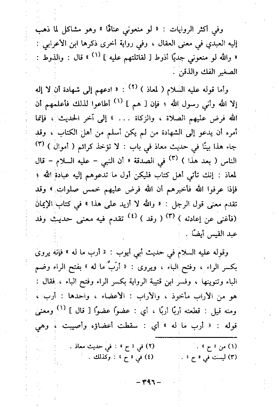وفى أكثر الروايات: (لو منعونى عناقًا) وهو مشاكل لما ذهب إليه العبدى فى معنى العقال، وفى رواية أخرى ذكرها ابن الأعرابى: (والله لو منعونى جديًا أذوط لقاتلتهم عليه) ، قال: والذوط: الصغير الفك والذقن. وأما قوله (صلى الله عليه وسلم) لمعاذ: (ادعهم إلى شهادة أن لا إله إلا الله وأنى رسول الله، فإن هم أطاعوا لذلك فأعلمهم أن الله فرض عليهم الصلاة، والزكاة. . .) إلى آخر الحديث، فإنما أمره أن يدعو إلى الشهادة من لم يكن أسلم من أهل الكتاب، وقد جاء هذا بينًا فى حديث معاذ فى باب: لا تؤخذ كرائم أموال الناس بعد هذا فى الصدقة: (أن النبى، (صلى الله عليه وسلم) ، قال لمعاذ: إنك تأتى أهل كتاب فليكن أول ما تدعوهم إليه عبادة الله، فإذا عرفوا الله، فأخبرهم أن الله فرض عليهم خمس صلوات) ، وقد تقدم معنى قول الرجل: (والله لا أزيد على هذا) فى كتاب الإيمان، فأغنى عن إعادته، وقد تقدم فيه معنى حديث وفد عبد القيس أيضًا. وقوله (صلى الله عليه وسلم) فى حديث أبى أيوب: (أرب ما له) ، فإنه يروى بكسر الراء، وفتح الباء، ويروى: (أرَبٌ ما له) بفتح الراء وضم الباء وتنوينها، وفسر ابن قتيبة الرواية بكسر الراء وفتح الباء، فقال: هو من الأراب مأخوذ، والأراب: الأعضاء، واحدها: أرب، ومنه قيل: قطعته أربًا أربًا، أى عضوًا عضوًا، قال: ومعنى قوله: (أرب ما له) أى سقطت أعضاؤه وأصيبت، وهى