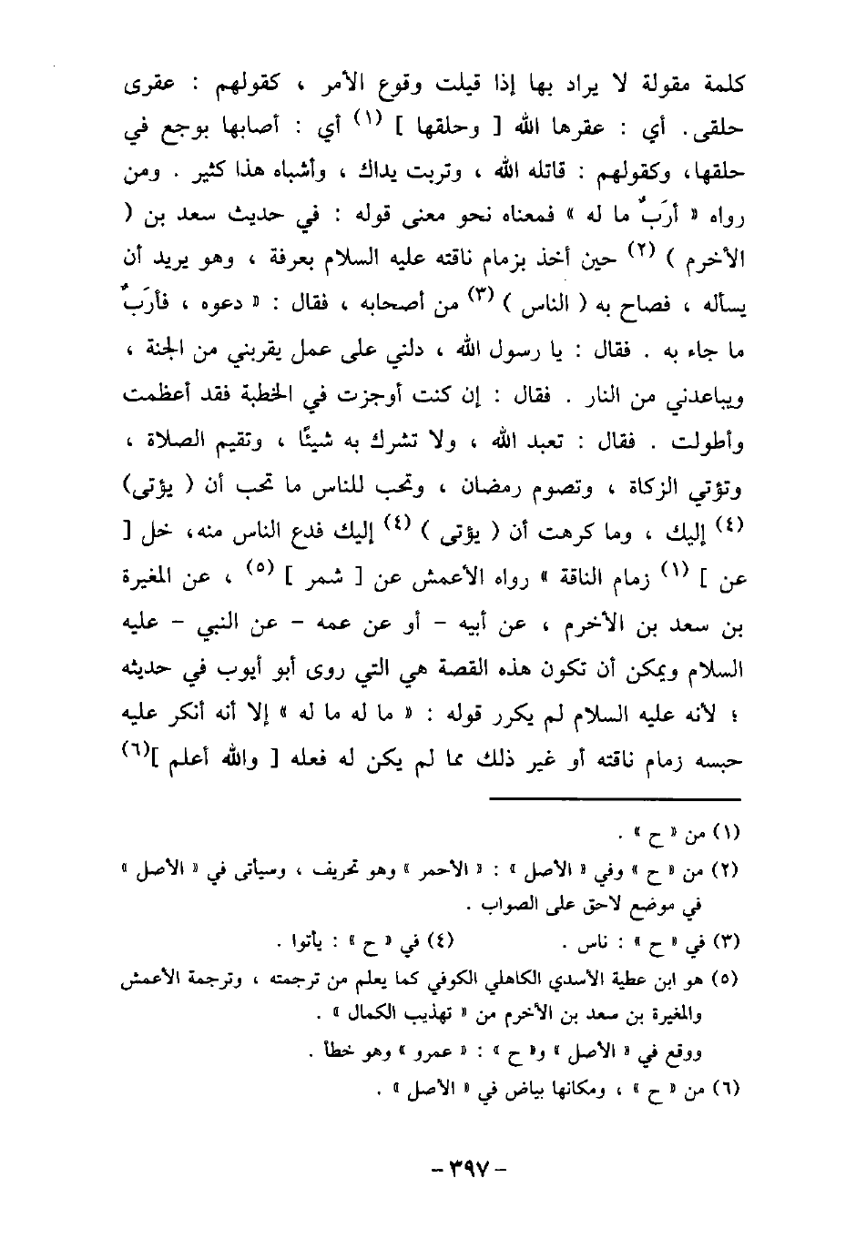 كلمة مقولة لا يراد بها إذا قيلت وقوع الأمر، كقولهم: عقرى حلقى، أى عقرها الله وحلقها، أى أصابها بوجع فى حلقها، وكقولهم: قاتله الله، وتربت يداك، وأشباه هذا كثير. ومن رواه (أرَبٌ ما له) فمعناه نحو معنى قوله: فى حديث سعد بن الأخرم حين أخذ بزمام ناقته (صلى الله عليه وسلم) بعرفة، وهو يريد أن يسأله، فصاح به الناس من أصحابه، فقال: (دعوه، فأربٌ ما جاء به، فقال: يا رسول الله، دلنى على عمل يقربنى من الجنة، ويباعدنى من النار، فقال: إن كنت أوجزت فى الخطبة، فقد أعظمت وأطولت، فقال: تعبد الله، ولا تشرك به شيئًا، وتقيم الصلاة، وتؤتى الزكاة، وتصوم رمضان، وتحب للناس ما تحب أن يؤتى إليك، وما كرهت أن يؤتى إليك فدع الناس منه، خل عن زمام الناقة) . رواه الأعمش، عن شمر، عن المغيرة بن سعد بن الأخرم، عن أبيه، أو عن عمه، عن النبى، (صلى الله عليه وسلم) ، ويمكن أن تكون هذه القصة هى التى روى أبو أيوب فى حديثه، لأنه (صلى الله عليه وسلم) لم يكرر قوله: (ما له ما له) إلا أنه أنكر عليه حبسه زمام ناقته أو غير ذلك مما لم يكن له فعله، والله أعلم،