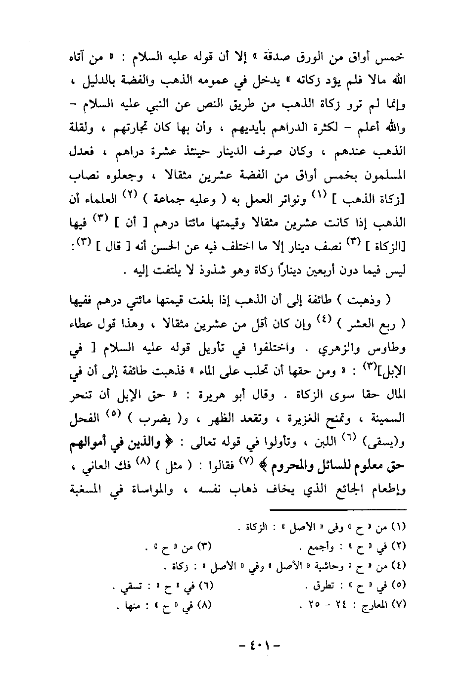 خمس أواق من الورق صدقة) ، إلا أن قوله (صلى الله عليه وسلم) : (من آتاه الله مالاً فلم يؤد زكاته) يدخل فى عمومه الذهب والفضة بالدليل، وإنما لم ترو زكاة الذهب من طريق النص عن النبى، (صلى الله عليه وسلم) ، والله أعلم، لكثرة الدراهم بأيديهم، وأن بها كان تجارتهم، ولقلة الذهب عندهم، وكان صرف الدينار حينئذ عشرة دراهم، فعدل المسلمون بخمس أواق من الفضة عشرين مثقالاً، وجعلوه نصاب زكاة الذهب وتواتر العمل به وعليه جماعة العلماء أن الذهب إذا كانت عشرين مثقالاً وقيمتها مائتا درهم أن فيها الزكاة نصف دينار إلا ما اختلف فيه عن الحسن أنه قال: ليس فيما دون أربعين دينارًا زكاة وهو شذوذ لا يلتفت إليه. وذهبت طائفة إلى أن الذهب إذا بلغت قيمتها مائتى درهم ففيها ربع العشر، وإن كان أقل من عشرين مثقالاً، وهذا قول عطاء وطاوس والزهرى. واختلفوا فى تأويل قوله (صلى الله عليه وسلم) فى الإبل: (ومن حقها أن تحلب على الماء) فذهبت طائفة إلى أن فى المال حقًا سوى الزكاة. وقال أبو هريرة: (حق الإبل أن تنحر السمينة، وتمنح الغزيرة، وتقعد الظهر، ويضرب الفحل، ويسقى اللبن، وتأولوا فى قوله تعالى: (والذين فى أموالهم حق معلوم للسائل والمحروم) [المعارج: 24، 25] ، فقالوا: مثل فك العانى، وإطعام الجائع الذى يخاف ذهاب نفسه، والمواساة فى المسغبة