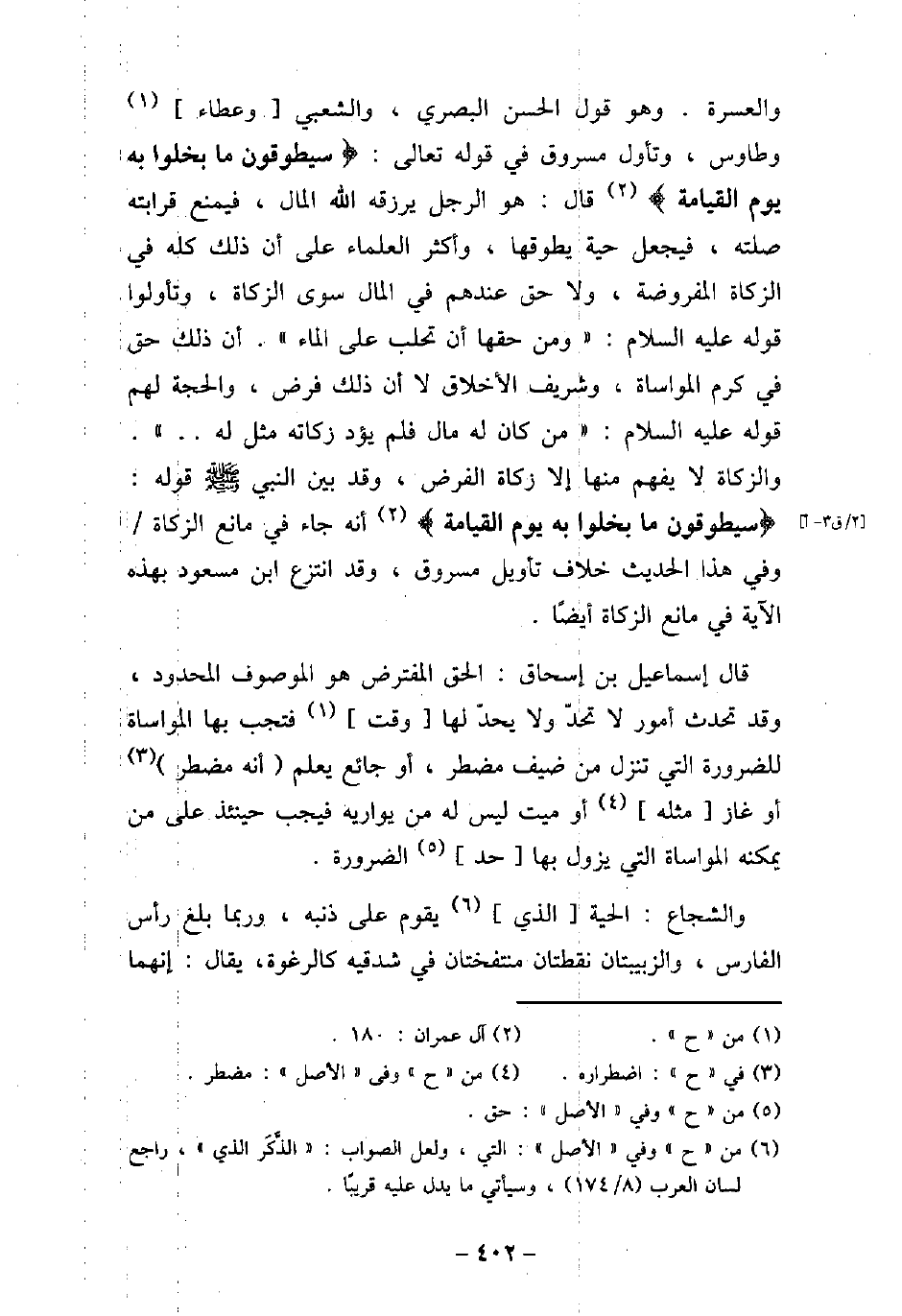 والعسرة. وهو قول الحسن البصرى، والشعبى، وعطاء، وطاوس، وتأول مسروق فى قوله تعالى: (سيطوقون ما بخلوا به يوم القيامة (قال: هو الرجل يرزقه الله المال، فيمنع قرابته صلته، فيجعل حية طوقها، وأكثر العلماء على أن ذلك كله فى الزكاة المفروضة، ولا حق عندهم فى المال سوى الزكاة، وتأولوا قوله (صلى الله عليه وسلم) : (ومن حقها أن تحلب على الماء) ، أن ذلك حق فى كرم المواساة، وشريف الأخلاق لا أن ذلك فرض، والحجة لهم قوله (صلى الله عليه وسلم) : (من كان له مال، فلم يؤد زكاته مثل له. . .) والزكاة لا يفهم منها إلا زكاة الفرض، وقد بين النبى (صلى الله عليه وسلم) قوله: (سيطوقون ما بخلوا به يوم القيامة (أنه جاء فى مانع الزكاة، وفى هذا الحديث خلاف تأويل مسروق، وقد انتزع ابن مسعود بهذه الآية فى مانع الزكاة أيضًا. قال إسماعيل بن إسحاق: الحق المفترض هو الموصوف المحدود، وقد تحدث أمور لا تحدّ ولا يحدّ لها وقت فتجب بها المواساة للضرورة التى تنزل من ضيف مضطر، أو جائع يعلم أنه مضطر، أو غاز مثله أو ميت ليس له من يواريه فيجب حينئذ على من يمكنه المواساة التى يزول بها حد الضرورة. والشجاع: الحية الذى يقوم على ذنبه، وربما بلغ رأس الفارس، والزبيبتان نقطتان منتفختان فى شدقيه كالرغوة، يقال: إنهما