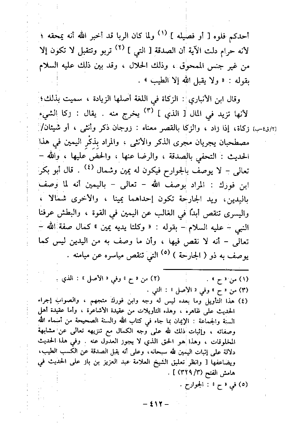 أحدكم فلوه، أو فصيله) ، ولما كان الربا قد أخبر الله أنه يمحقه، لأنه حرام دلت الآية أن الصدقة التى تربو وتتقبل لا تكون إلا من غير جنس الممحوق، وذلك الحلال، وقد بين ذلك (صلى الله عليه وسلم) بقوله: (ولا يقبل الله إلا الطيب) . وقال ابن الأنبارى: الزكاة فى اللغة أصلها الزيادة، سميت بذلك لأنها تزيد فى المال الذى يخرج منه. يقال: زكا الشىء زكاة، إذا زاد، والزكا بالقصر معناه: زوجان ذكر وأنثى، أو شيئان مصطحبان يجريان مجرى الذكر والأنثى، والمراد بذكر اليمين فى هذا الحديث: التحفى بالصدقة، والرضا عنها، والحض عليها، والله تعالى لا يوصف بالجوارح فيكون له يمين وشمال. قال أبو بكر بن فورك: المراد بوصف الله تعالى باليمين أنه لما وصف باليدين، ويد الجارحة تكون إحداهما يمينًا، والأخرى شمالاً، واليسرى تنقص أبدًا فى الغالب عن اليمين فى القوة، والبطش عرفنا النبى، (صلى الله عليه وسلم) ، بقوله: (وكلتا يديه يمين) كمال صفة الله تعالى أنه لا نقص فيها، وأن ما وصف به من اليدين ليس كما يوصف به ذو الجارحة التى تنقص مياسره عن ميامنه.