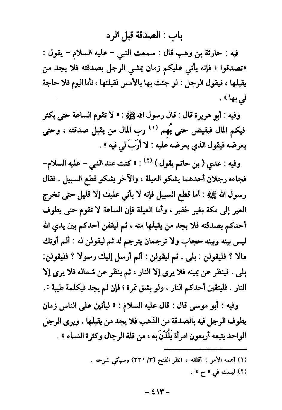 / 15 - فيه: حَارِثَةَ بْنَ وَهْبٍ، قَالَ: سَمِعْتُ النَّبِىَّ (صلى الله عليه وسلم) يَقُولُ: (تَصَدَّقُوا فَإِنَّهُ يَأْتِى عَلَيْكُمْ زَمَانٌ يَمْشِى الرَّجُلُ بِصَدَقَتِهِ فَلا يَجِدُ مَنْ يَقْبَلُهَا، فيَقُولُ الرَّجُلُ: لَوْ جِئْتَ بِهَا بِالأمْسِ لَقَبِلْتُهَا، فَأَمَّا الْيَوْمَ فَلا حَاجَةَ لِى بِهَا) . / 16 - وفيه: أَبُو هُرَيْرَةَ، قَالَ: قَالَ رسول اللَّه (صلى الله عليه وسلم) : (لا تَقُومُ السَّاعَةُ حَتَّى يَكْثُرَ فِيكُمُ الْمَالُ، فَيَفِيضَ حَتَّى يُهِمَّ رَبَّ الْمَالِ مَنْ يَقْبَلُ صَدَقَتَهُ، وَحَتَّى يَعْرِضَهُ فَيَقُولَ الَّذِى يَعْرِضُهُ عَلَيْهِ: لا أَرَبَ لِى فيه) . / 17 - وفيه: عَدِىَّ بْنَ حَاتِمٍ يَقُولُ: كُنْتُ عِنْدَ النّبِىّ (صلى الله عليه وسلم) فَجَاءَهُ رَجُلانِ أَحَدُهُمَا يَشْكُو الْعَيْلَةَ، وَالآخَرُ يَشْكُو قَطْعَ السَّبِيلِ، فَقَالَ رَسُولُ اللَّهِ (صلى الله عليه وسلم) : (أَمَّا قَطْعُ السَّبِيلِ، فَإِنَّهُ لا يَأْتِى عَلَيْكَ إِلا قَلِيلٌ حَتَّى تَخْرُجَ الْعِيرُ إِلَى مَكَّةَ بِغَيْرِ خَفِيرٍ، وَأَمَّا الْعَيْلَةُ، فَإِنَّ السَّاعَةَ لا تَقُومُ حَتَّى يَطُوفَ أَحَدُكُمْ بِصَدَقَتِهِ فلا يَجِدُ مَنْ يَقْبَلُهَا مِنْهُ، ثُمَّ لَيَقِفَنَّ أَحَدُكُمْ بَيْنَ يَدَىِ اللَّهِ لَيْسَ بَيْنَهُ وَبَيْنَهُ حِجَابٌ وَلا تَرْجُمَانٌ يُتَرْجِمُ لَهُ، ثُمَّ لَيَقُولَنَّ لَهُ: أَلَمْ أُوتِكَ مَالاً، فَلَيَقُولَنَّ: بَلَى، ثُمَّ لَيَقُولَنَّ: أَلَمْ أُرْسِلْ إِلَيْكَ رَسُولاً؟ فَلَيَقُولَنَّ: بَلَى، فَيَنْظُرُ عَنْ يَمِينِهِ فَلا يَرَى إِلا النَّارَ، ثُمَّ يَنْظُرُ عَنْ شِمَالِهِ فَلا يَرَى إِلا النَّارَ، فَلْيَتَّقِيَنَّ أَحَدُكُمُ النَّارَ، وَلَوْ بِشِقِّ تَمْرَةٍ، فَإِنْ لَمْ يَجِدْ فَبِكَلِمَةٍ طَيِّبَةٍ) . / 18 - وفيه: أَبُو مُوسَى، قَالَ: قَالَ (صلى الله عليه وسلم) : (لَيَأْتِيَنَّ عَلَى النَّاسِ زَمَانٌ يَطُوفُ الرَّجُلُ فِيهِ بِالصَّدَقَةِ مِنَ الذَّهَبِ، فلا يَجِدُ من يقبلها، وَيُرَى الرَّجُلُ الْوَاحِدُ يَتْبَعُهُ أَرْبَعُونَ امْرَأَةً يَلُذْنَ بِهِ مِنْ قِلَّةِ الرِّجَالِ وَكَثْرَةِ النِّسَاءِ) .