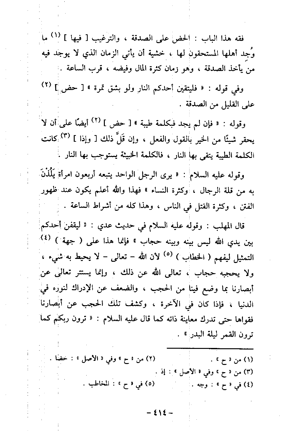 ففى هذا الباب: الحض على الصدقة، والترغيب فيها ما وُجِد أهلها المستحقون لها، خشية أن يأتى الزمان الذى لا يوجد فيه من يأخذ الصدقة، وهو زمان كثرة المال وفيضه، قرب الساعة. وفى قوله: (فليتقين أحدكم النار ولو بشق تمرة) حض على القليل من الصدقة. وقوله: (فإن لم يجد فبكلمة طيبة) حض أيضًا على أن لا يحقر شيئًا من الخير بالقول والفعل، وإن قَلَّ ذلك، وإذا كانت الكلمة الطيبة يتقى بها النار، فالكلمة الخبيثة يستوجب بها النار. وقوله (صلى الله عليه وسلم) : (يرى الرجل الواحد يتبعه أربعون امرأة يَلُذْنَ به من قلة الرجال، وكثرة النساء) ، فهذا والله أعلم يكون عند ظهور الفتن، وكثرة القتل فى الناس، وهذا كله من أشراط الساعة. قال المهلب: وقوله (صلى الله عليه وسلم) فى حديث عدى: (ليقفن أحدكم بين يدى الله ليس بينه وبينه حجاب) ، فإنما هذا على جهة التمثيل ليفهم الخطاب لأن الله تعالى لا يحيط به شىء، ولا يحجبه حجاب، تعالى الله عن ذلك، وإنما يستتر تعالى عن أبصارنا بما وضع فينا من الحجب، والضعف عن الإدراك لنوره فى الدنيا، فإذا كان فى الآخرة، وكشف تلك الحجب عن أبصارنا فقواها حتى تدرك معاينة ذاته كما قال (صلى الله عليه وسلم) : (ترون ربكم كما ترون القمر ليلة البدر) .