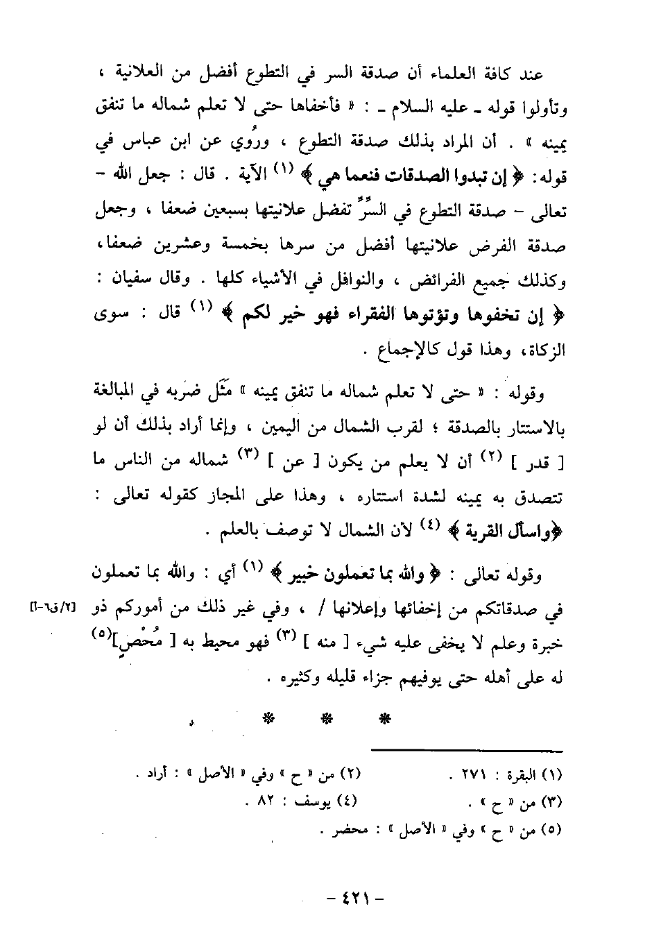 عند كافة العلماء أن صدقة السر فى التطوع أفضل من العلانية، وتأولوا قوله، (صلى الله عليه وسلم) : (فأخفاها حتى لا تعلم شماله ما تنفق يمينه) . أن المراد بذلك صدقة التطوع، وروى عن ابن عباس فى قوله: (إن تبدوا الصدقات فنعما هى) [البقرة: 271] الآية. قال: جعل الله تعالى صدقة التطوع فى السرِّ تفضل علانيتها بسبعين ضعفًا، وجعل صدقة الفرض علانيتها أفضل من سرها بخمسة وعشرين ضعفًا، وكذلك جميع الفرائض، والنوافل فى الأشياء كلها. وقال سفيان: (إن تخفوها وتؤتوها الفقراء فهو خير لكم (قال: سوى الزكاة، وهذا قول كالإجماع. وقوله: (حتى لا تعلم شماله ما تنفق يمينه) مثل ضربه فى المبالغة بالاستتار بالصدقة، لقرب الشمال من اليمين، وإنما أراد بذلك أن لو قدر أن لا يعلم من يكون عن شماله من الناس ما تتصدق به يمينه لشدة استتاره، وهذا على المجاز كقوله تعالى: (واسأل القرية) [يوسف: 82] لأن الشمال لا توصف بالعلم. وقوله تعالى: (والله بما تعملون خبير) [البقرة: 271] أى والله بما تعملون فى صدقاتكم من إخفائها وإعلانها، وفى غير ذلك من أموركم ذو خبرة وعلم لا يخفى عليه شىء منه، فهو محيط به مُحْصٍ له على أهله حتى يوفيهم جزاء قليله وكثيره.