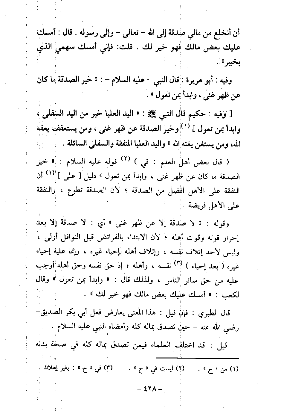 أَنْ أَنْخَلِعَ مِنْ مَالِى صَدَقَةً إِلَى اللَّهِ تَعَالَى وَإِلَى رَسُولهِ (صلى الله عليه وسلم) قَالَ: (أَمْسِكْ عَلَيْكَ بَعْضَ مَالِكَ، فَهُوَ خَيْرٌ لَكَ) ، قُلْتُ: فَإِنِّى أُمْسِكُ سَهْمِى الَّذِى بِخَيْبَرَ. / 28 - وفيه: أَبُو هُرَيْرَةَ، قَالَ: النَّبِىِّ، (صلى الله عليه وسلم) : (خَيْرُ الصَّدَقَةِ مَا كَانَ عَنْ ظَهْرِ غِنًى، وَابْدَأْ بِمَنْ تَعُولُ) . / 29 - وفيه: حَكِيمِ، قَالَ النَّبِىِّ (صلى الله عليه وسلم) : (الْيَدُ الْعُلْيَا خَيْرٌ مِنَ الْيَدِ السُّفْلَى، وَابْدَأْ بِمَنْ تَعُولُ، وَخَيْرُ الصَّدَقَةِ عَنْ ظَهْرِ غِنًى، وَمَنْ يَسْتَعْفِفْ يُعِفَّهُ اللَّهُ، وَمَنْ يَسْتَغْنِ يُغْنِهِ اللَّهُ) . وَالْيَدُ الْعُلْيَا الْمُنْفِقَةُ، وَالسُّفْلَى السَّائِلَةُ. قال بعض أهل العلم: فى قوله (صلى الله عليه وسلم) : (خير الصدقة ما كان عن ظهر غنى، وابدأ بمن تعول) دليل على أن النفقة على الأهل أفضل من الصدقة، لأن الصدقة تطوع، والنفقة على الأهل فريضة. وقوله: (لا صدقة إلا عن ظهر غنى) أى لا صدقة إلا بعد إحراز قوته وقوت أهله، لأن الابتداء بالفرائض قبل النوافل أولى، وليس لأحد إتلاف نفسه، وإتلاف أهله بإحياء غيره، وإنما عليه إحياء غيره بعد إحياء نفسه، وأهله، إذ حق نفسه وحق أهله أوجب عليه من حق سائر الناس، ولذلك قال: (وابدأ بمن تعول) ، وقال لكعب: (أمسك عليك بعض مالك فهو خير لك) . قال الطبرى: فإن قيل: هذا المعنى يعارض فعل أبى بكر الصديق، رضى الله عنه، حين تصدق بماله كله، وأمضاه النبى (صلى الله عليه وسلم) . قيل: قد اختلف العلماء فيمن تصدق بماله كله فى صحة بدنه