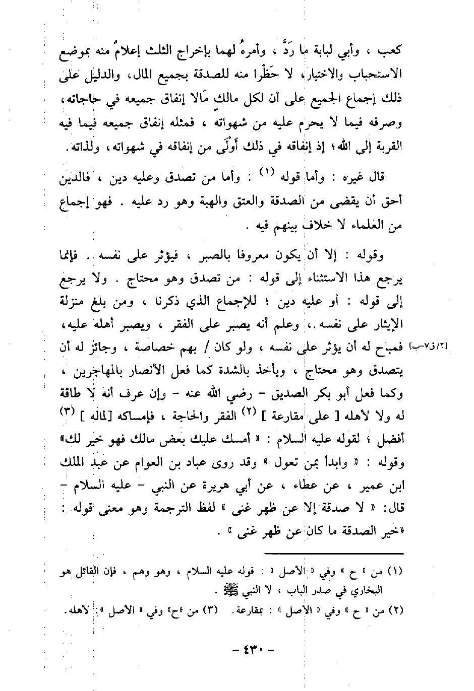 كعب، وأبى لبابة ما رَدَّ، وأمرهُ لهما بإخراج الثلث إعلامٌ منه بموضع الاستحباب والاختيار، لا حَظْرا منه للصدقة بجميع المال، والدليل على ذلك إجماع الجميع على أن لكل مالك مالا إنفاق جميعه فى حاجاته، وصرفه فيما لا يحرم عليه من شهواته، فمثله إنفاق جميعه فيما فيه القربة إلى الله، إذ إنفاقه فى ذلك أولَى من إنفاقه فى شهواته، ولذاته. قال غيره: وأما قوله: وأما من تصدق وعليه دين، فالدين أحق أن يقضى من الصدقة والعتق والهبة، وهو رد عليه. فهو إجماع من العلماء لا خلاف بينهم فيه. وقوله: إلا أن يكون معروفًا بالصبر، فيؤثر على نفسه. فإنما يرجع هذا الاستثناء إلى قوله: من تصدق وهو محتاج. ولا يرجع إلى قوله: أو عليه دين، للإجماع الذى ذكرنا، ومن بلغ منزلة الإيثار على نفسه، وعلم أنه يصبر على الفقر، ويصبر أهله عليه، فمباح له أن يؤثر على نفسه، ولو كان بهم خصاصة، وجائز له أن يتصدق وهو محتاج، ويأخذ بالشدة كما فعل الأنصار بالمهاجرين، وكما فعل أبو بكر الصديق، رضى الله عنه، وإن عرف أنه لا طاقة له ولا لأهله على مقارعة الفقر والحاجة، فإمساكه لماله أفضل، لقوله (صلى الله عليه وسلم) : (أمسك عليك بعض مالك فهو خير لك) وقوله: (وابدأ بمن تعول) وقد روى عباد بن العوام عن عبد الملك بن عمير، عن عطاء، عن أبى هريرة، عن النبى، (صلى الله عليه وسلم) ، قال: (لا صدقة إلا عن ظهر غنى) لفظ الترجمة وهو معنى قوله: (خير الصدقة ما كان عن ظهر غنى) .