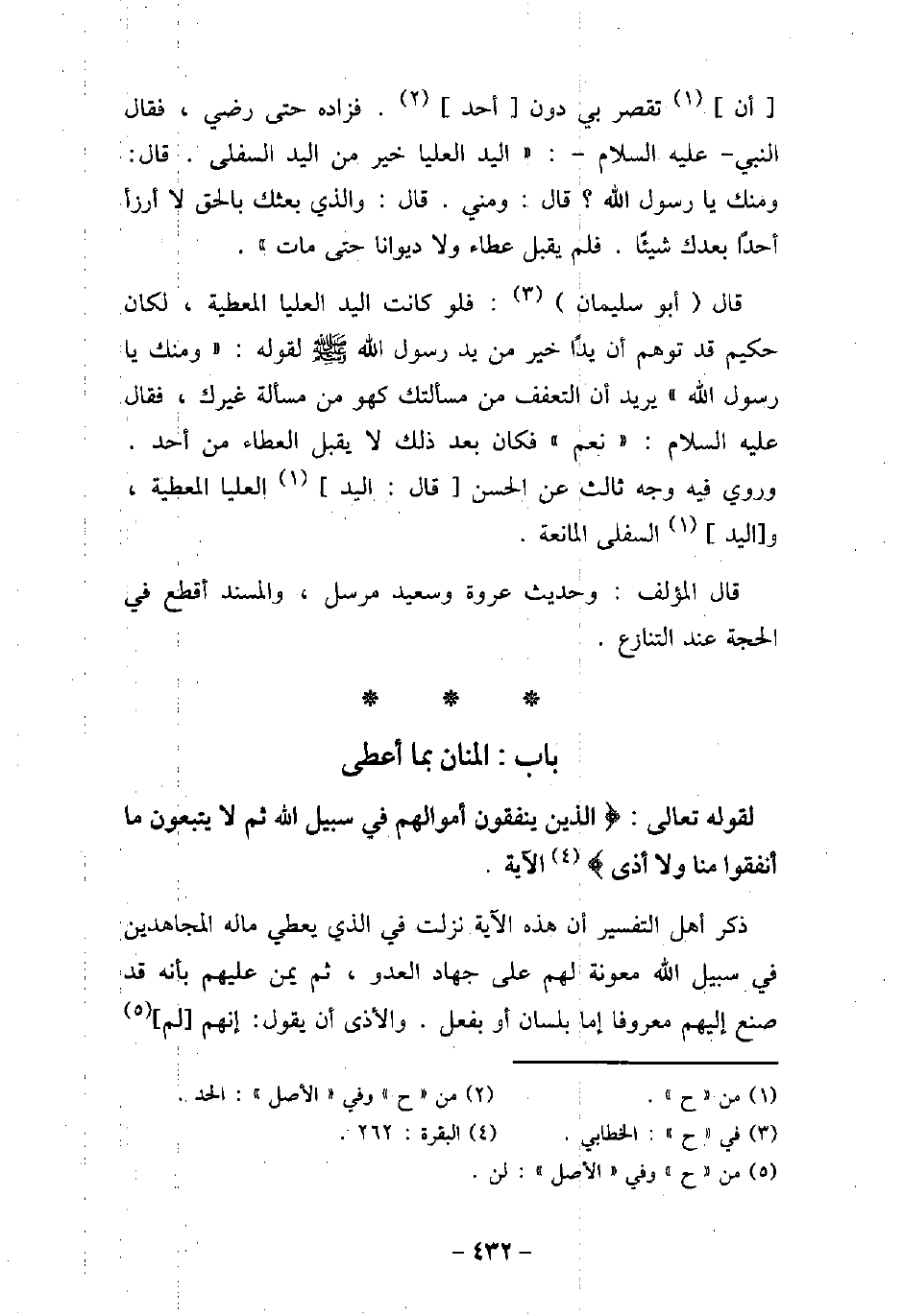 لِقَوْلِهِ تَعَالَى: (الَّذِينَ يُنْفِقُونَ أَمْوَالَهُمْ فِى سَبِيلِ اللَّهِ ثُمَّ لا يُتْبِعُونَ مَا أَنْفَقُوا مَنًّا وَلا أَذًى (الآيَةَ [البقرة: 262] ذكر أهل التفسير أن هذه الآية نزلت فى الذى يعطى ماله المجاهدين فى سبيل الله معونة لهم على جهاد العدو، ثم يمن عليهم بأنه قد صنع إليهم معروفًا إما بلسان أو بفعل، والأذى أن يقول: إنهم لم