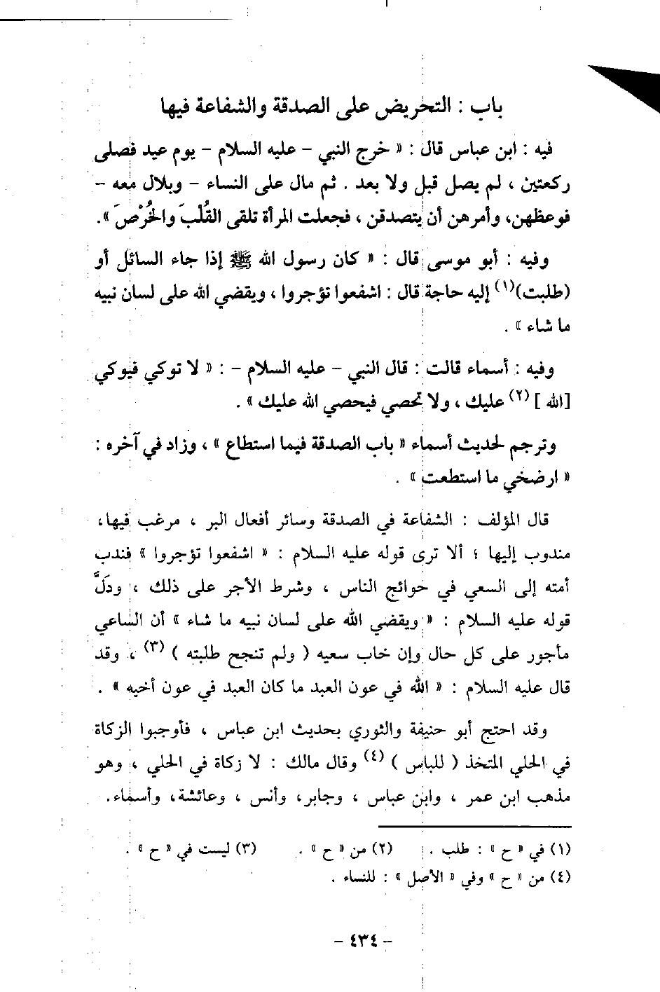 / 31 - فيه: ابْنِ عَبَّاس، قَالَ: خَرَجَ النَّبِىُّ، (صلى الله عليه وسلم) ، يَوْمَ عِيدٍ فَصَلَّى رَكْعَتَيْنِ، لَمْ يُصَلِّ قَبْلُ وَلا بَعْدُ، ثُمَّ مَالَ عَلَى النِّسَاءِ، وَبِلالٌ مَعَهُ، فَوَعَظَهُنَّ، وَأَمَرَهُنَّ أَنْ يَتَصَدَّقْنَ، فَجَعَلَتِ الْمَرْأَةُ تُلْقِى الْقُلْبَ وَالْخُرْصَ. / 32 - وفيه: أَبُو مُوسَى، قَالَ: كَانَ رَسُولُ اللَّهِ (صلى الله عليه وسلم) إِذَا جَاءَهُ السَّائِلُ أَوْ طُلِبَتْ إِلَيْهِ حَاجَةٌ قَالَ: (اشْفَعُوا، تُؤْجَرُوا، وَيَقْضِى اللَّهُ عَلَى لِسَانِ نَبِيِّهِ مَا شَاءَ) . / 33 - وفيه: أَسْمَاءَ، قَالَتْ: قَالَ لِىَ النَّبِىُّ، (صلى الله عليه وسلم) : (لا تُوكِى، فَيُوكَى الله عَلَيْكِ ولا تُحْصِى فَيُحْصِىَ اللَّهُ عَلَيْكِ) . وترجم لحديث أسماء باب (الصَّدَقَةِ فِيمَا اسْتَطَاعَ) ، وزاد فى آخره: (ارْضَخِى مَا اسْتَطَعْتِ) . قال المؤلف: الشفاعة فى الصدقة وسائر أفعال البر، مرغب فيها، مندوب إليها، ألا ترى قوله (صلى الله عليه وسلم) : (اشفعوا تؤجروا) ، فندب أمته إلى السعى فى حوائج الناس، وشرط الأجر على ذلك، ودَلَّ قوله (صلى الله عليه وسلم) : (ويقضى الله على لسان نبيه ما شاء) أن الساعى مأجور على كل حال، وإن خاب سعيه ولم تنجح طلبته، وقد قال (صلى الله عليه وسلم) : (الله فى عون العبد ما كان العبد فى عون أخيه) . وقد احتج أبو حنيفة والثورى بحديث ابن عباس، فأوجبوا الزكاة فى الحلى للباس، وقال مالك: لا زكاة فى الحلى، وهو مذهب ابن عمر، وابن عباس، وجابر، وأنس، وعائشة، وأسماء.