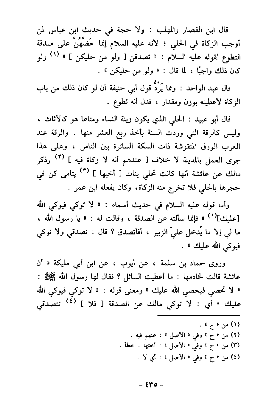قال ابن القصار، والمهلب: ولا حجة فى حديث ابن عباس لمن أوجب الزكاة فى الحلى، لأنه (صلى الله عليه وسلم) إنما حَضَّهُنَّ على صدقة التطوع لقوله (صلى الله عليه وسلم) : (تصدقن ولو من حليكن) ، ولو كان ذلك واجبًا، لما قال: (ولو من حليكن) . قال عبد الواحد: ومما يَرُدُّ قول أبى حنيفة أن لو كان ذلك من باب الزكاة لأعطينه بوزن ومقدار، فدل أنه تطوع. قال أبو عبيد: الحلى الذى يكون زينة النساء ومتاعًا هو كالأثاث، وليس كالرقة التى وردت السنة بأخذ ربع العشر منها. والرقة عند العرب الورق ذات السكة السائرة بين الناس، وعلى هذا جرى العمل بالمدينة لا خلاف عندهم أنه لا زكاة فيه، وذكر مالك، عن عائشة، أنها كانت تحلى بنات أخيها يتامى كن فى حجرها بالحلى فلا تخرج منه الزكاة، وكان يفعله ابن عمر. وأما قوله (صلى الله عليه وسلم) فى حديث أسماء: (لا توكى فيوكى الله عليك) ، فإنما سألته عن الصدقة، وقالت له: يا رسول الله، ما لى إلا ما يُدخل علىّ الزبير، أفأتصدق؟ قال: (تصدقى ولا توكى فيوكى الله عليك) . وروى حماد بن سلمة، عن أيوب، عن ابن أبى مليكة، أن عائشة قالت لخادمها: ما أعطيت السائل؟ فقال لها رسول الله (صلى الله عليه وسلم) : (لا تحصى فيحصى الله عليك) ، ومعنى قوله: (لا توكى فيوكى الله عليك) ، أى لا توكى مالك عن الصدقة، فلا تتصدقى